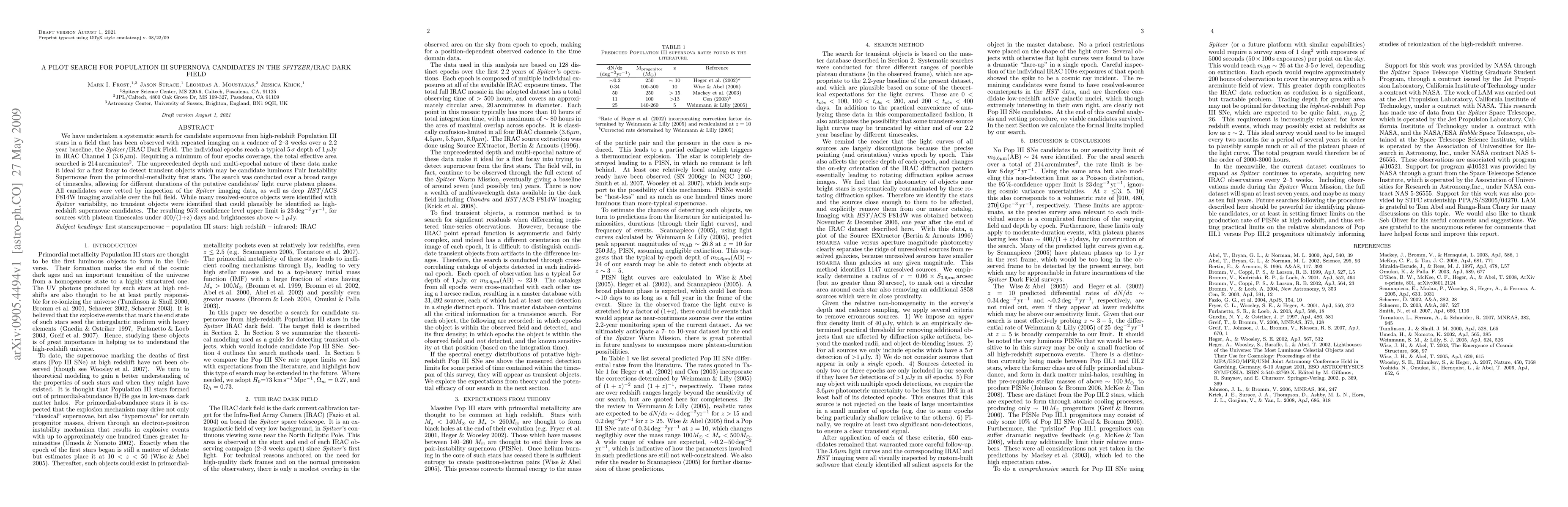 This study systematically searched for high-redshift Population III supernova candidates in the Spitzer/IRAC Dark Field using deep, multi-epoch imaging data. Despite the search covering a broad range of timescales and achieving a 5-sigma depth of 1 uJy, no transient objects were identified as plausible high-redshift supernova candidates, resulting in an upper limit of 23/sq deg/yr for such events.