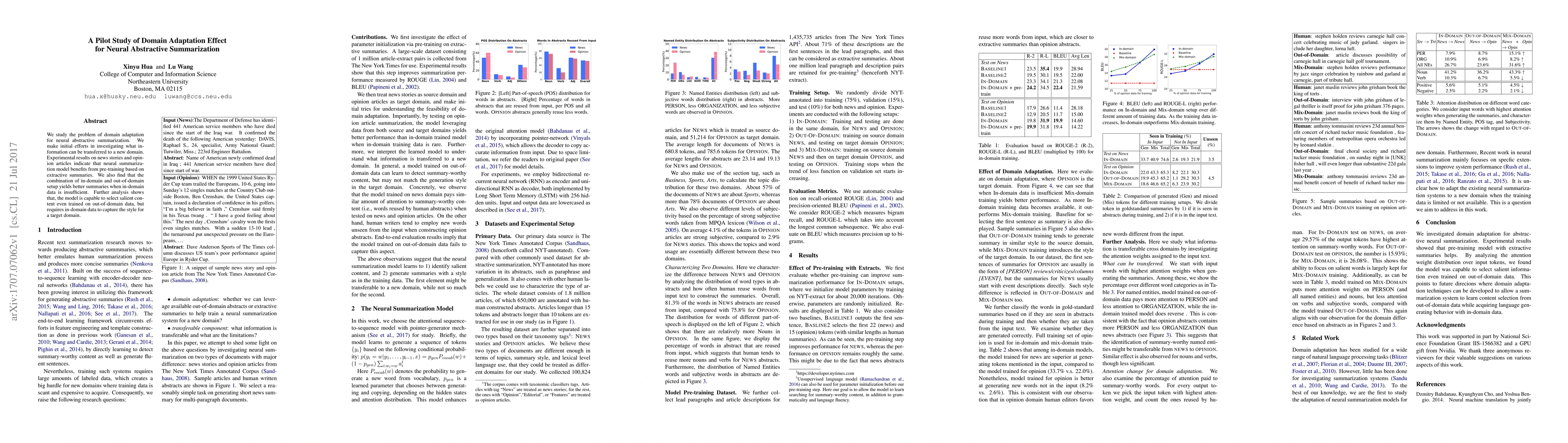 This pilot study explores domain adaptation in neural abstractive summarization, showing that pre-training with extractive summaries improves model performance. Combining in-domain and out-of-domain data produces better summaries when in-domain data is scarce, though the model selects salient content effectively even with out-of-domain training.