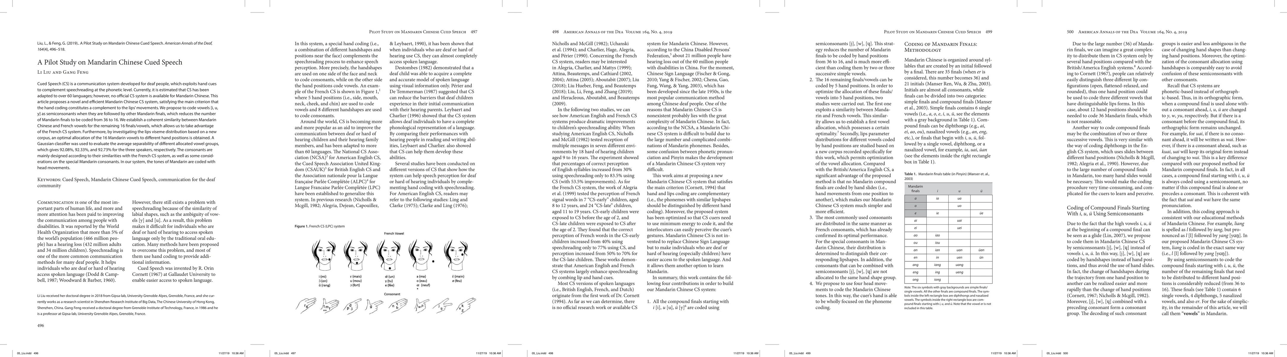 This paper proposes a novel Mandarin Chinese Cued Speech system, adapting hand cues to complement speechreading. It reduces the number of Mandarin finals coded from 36 to 16 by using semiconsonants for certain vowels and leveraging similarities between Mandarin and French vowels, achieving 92.33% average separability. Tones are coded with head movements.