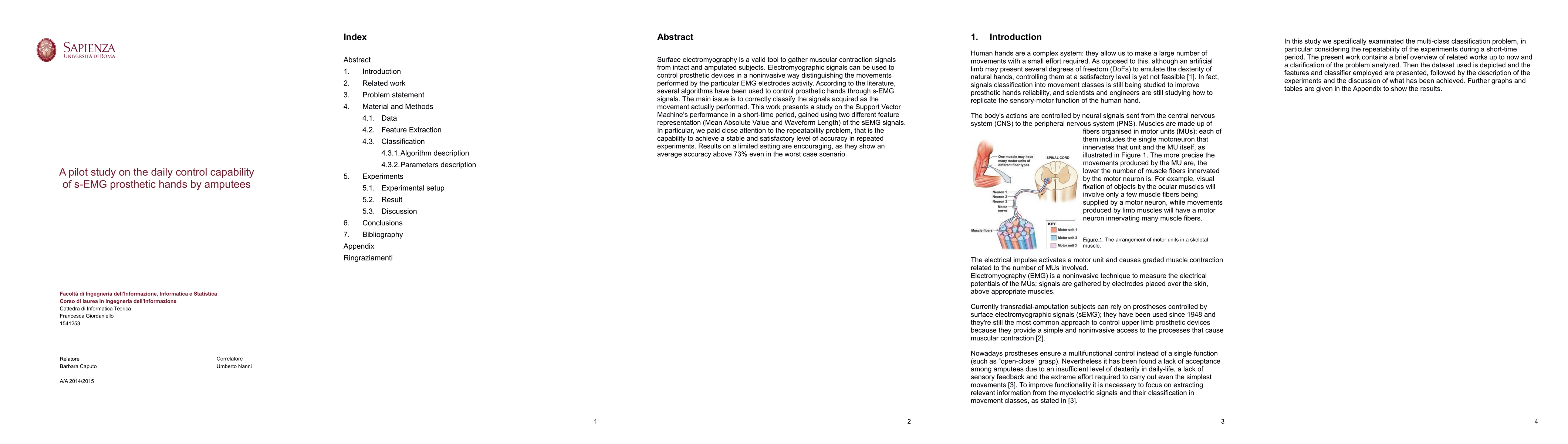 Surface electromyography is a valid tool to gather muscular contraction signals from intact and amputated subjects. Electromyographic signals can be used to control prosthetic devices in a noninvasive way distinguishing the movements performed by the particular EMG electrodes activity. According to the literature, several algorithms have been used to control prosthetic hands through s-EMG signals. The main issue is to correctly classify the signals acquired as the movement actually performed. This work presents a study on the Support Vector Machine's performance in a short-time period, gained using two different feature representation (Mean Absolute Value and Waveform Length) of the sEMG signals. In particular, we paid close attention to the repeatability problem, that is the capability to achieve a stable and satisfactory level of accuracy in repeated experiments. Results on a limited setting are encouraging, as they show an average accuracy above 73% even in the worst case scenario.