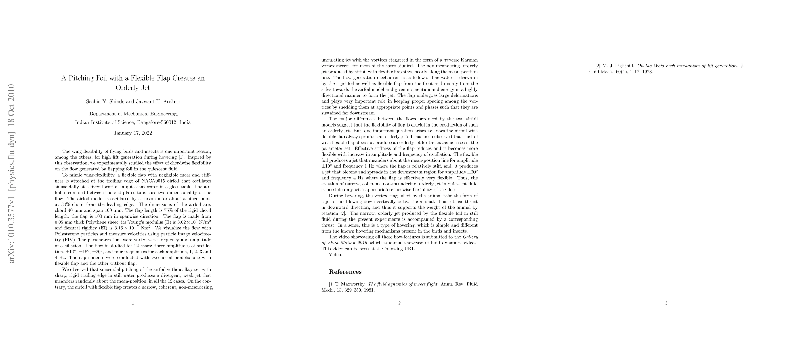 This study experimentally investigates how flexibility in a sinusoidally pitching foil influences fluid flow, finding that a rigid foil generates a weak, meandering jet, while a foil with a flexible flap produces a narrow, coherent jet, accompanied by thrust, indicating a form of hovering.