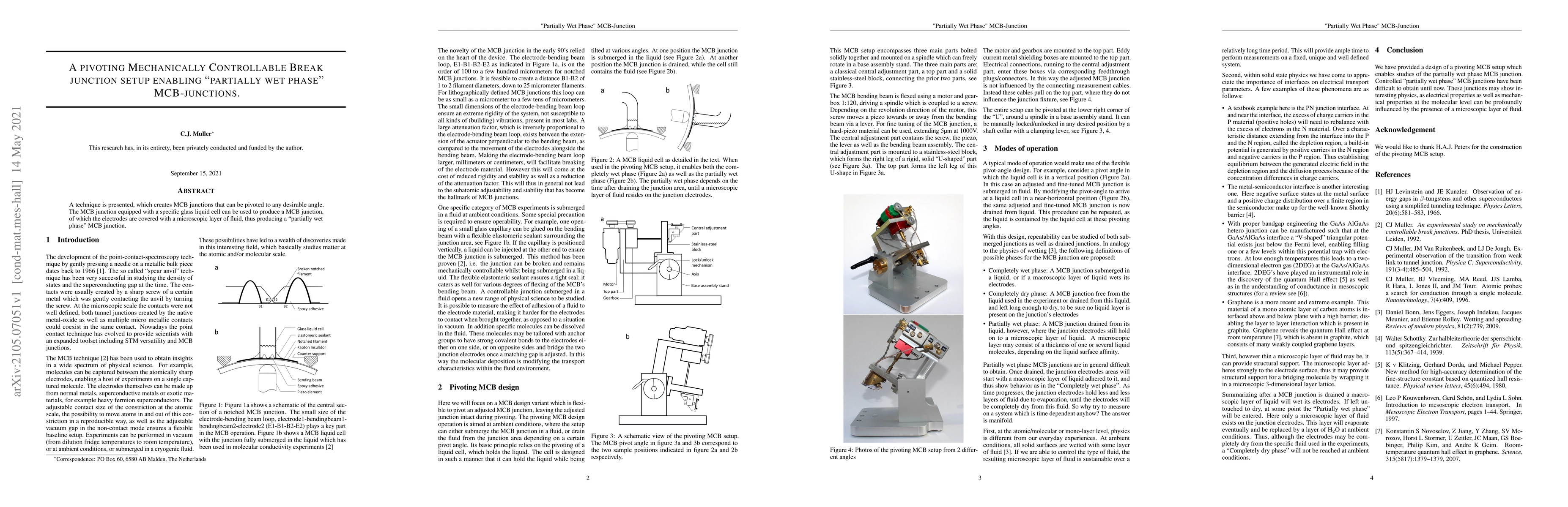 A technique is presented, which creates MCB junctions that can be pivoted to any desirable angle. The MCB junction equipped with a specific glass liquid cell can be used to produce a MCB junction, of which the electrodes are covered with a microscopic layer of fluid, thus producing a partially wet phase MCB junction.