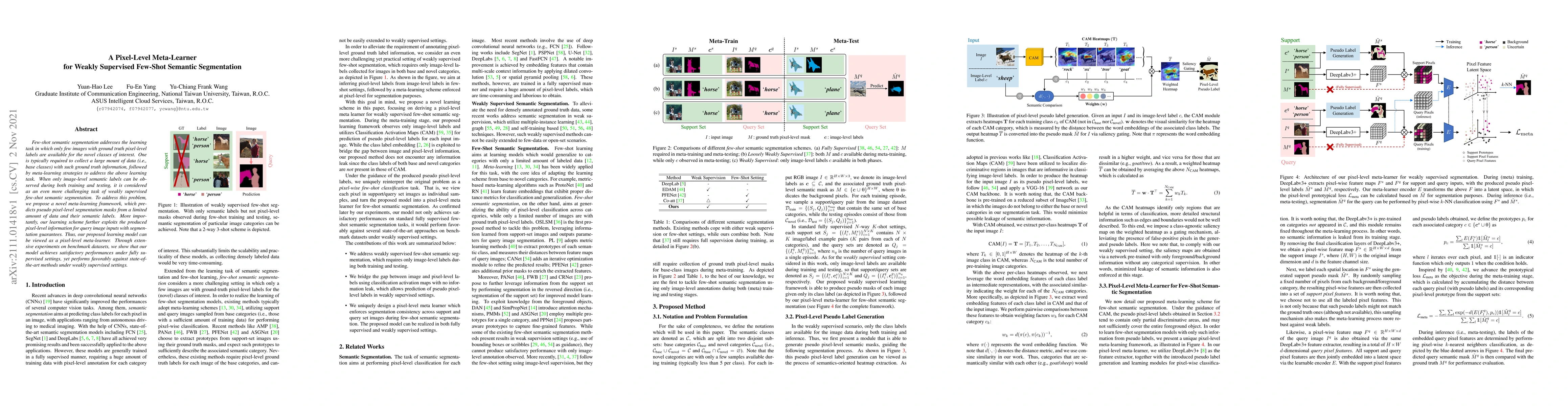 Few-shot semantic segmentation addresses the learning task in which only few images with ground truth pixel-level labels are available for the novel classes of interest. One is typically required to collect a large mount of data (i.e., base classes) with such ground truth information, followed by meta-learning strategies to address the above learning task. When only image-level semantic labels can be observed during both training and testing, it is considered as an even more challenging task of weakly supervised few-shot semantic segmentation. To address this problem, we propose a novel meta-learning framework, which predicts pseudo pixel-level segmentation masks from a limited amount of data and their semantic labels. More importantly, our learning scheme further exploits the produced pixel-level information for query image inputs with segmentation guarantees. Thus, our proposed learning model can be viewed as a pixel-level meta-learner. Through extensive experiments on benchmark datasets, we show that our model achieves satisfactory performances under fully supervised settings, yet performs favorably against state-of-the-art methods under weakly supervised settings.