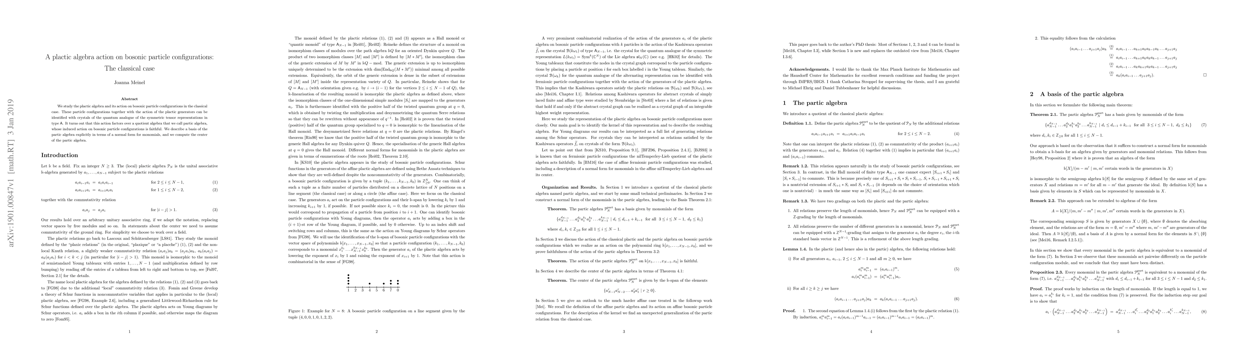We study the plactic algebra and its action on bosonic particle configurations in the classical case. These particle configurations together with the action of the plactic generators can be identified with crystals of the quantum analogue of the symmetric tensor representations in type A. It turns out that this action factors over a quotient algebra that we call partic algebra, whose induced action on bosonic particle configurations is faithful. We describe a basis of the partic algebra explicitly in terms of a normal form for monomials, and we compute the center of the partic algebra.