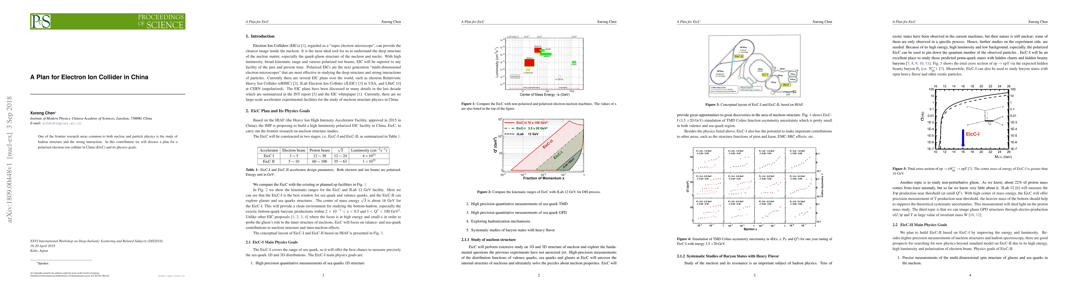 One of the frontier research areas common to both nuclear and particle physics is the study of hadron structure and the strong interaction. In this contribution we will discuss a plan for a polarized electron-ion collider in China (EicC) and its physics goals.