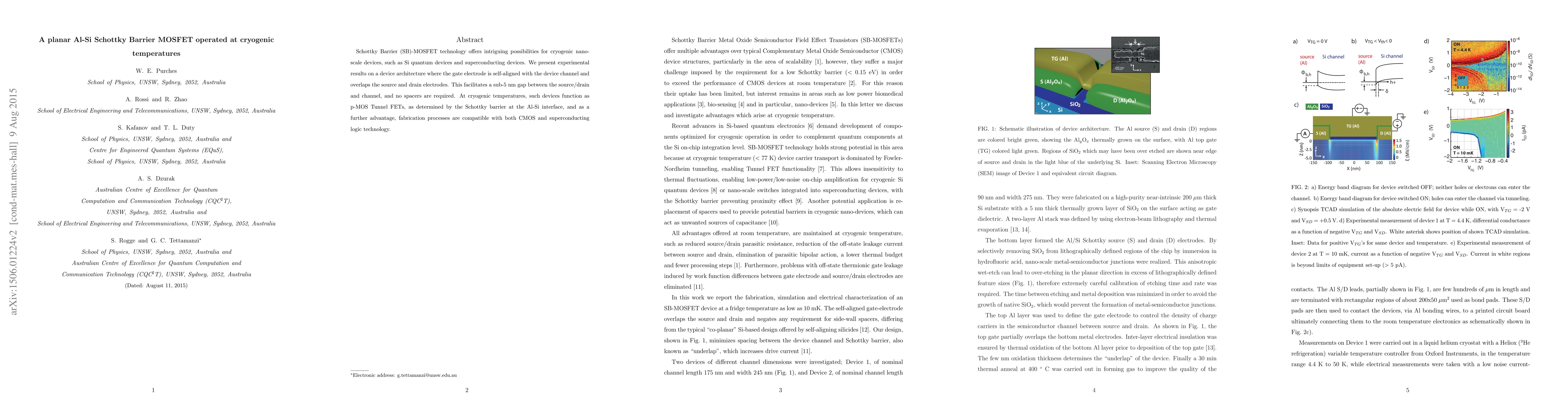 This paper presents a novel planar Al-Si Schottky Barrier MOSFET with a self-aligned gate electrode, enabling sub-5 nm source/drain-channel gaps without spacers. At cryogenic temperatures, the device operates as a p-MOS Tunnel FET, leveraging the Al-Si interface, and is compatible with both CMOS and superconducting logic fabrication processes.