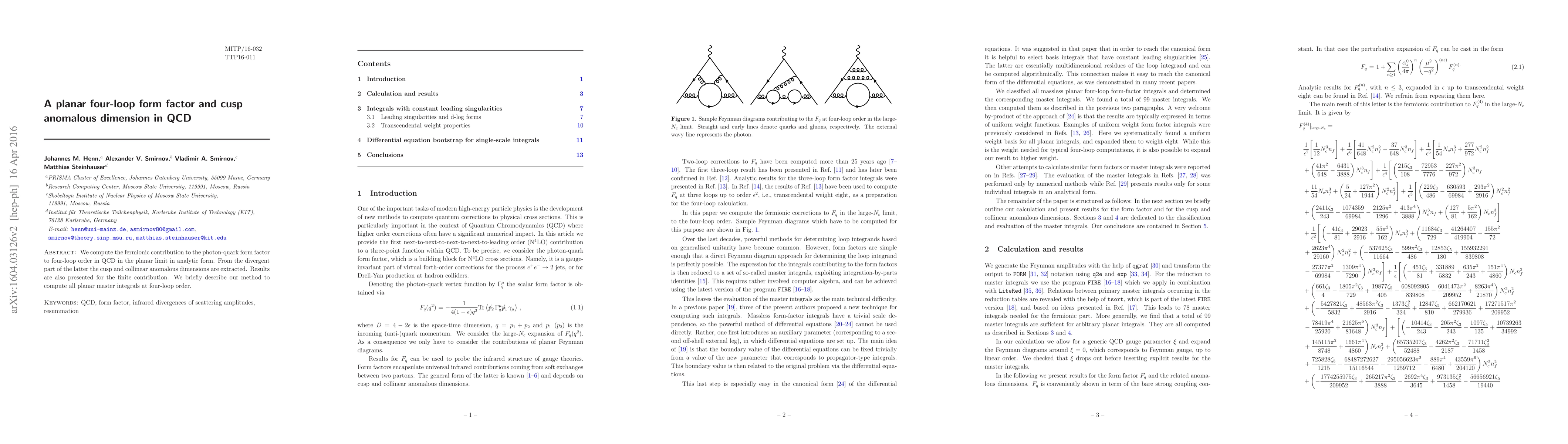 This paper computes the four-loop planar limit of the photon-quark form factor in QCD, extracting the cusp and collinear anomalous dimensions from the divergent part. The method used to compute the necessary planar master integrals at this order is also briefly described.