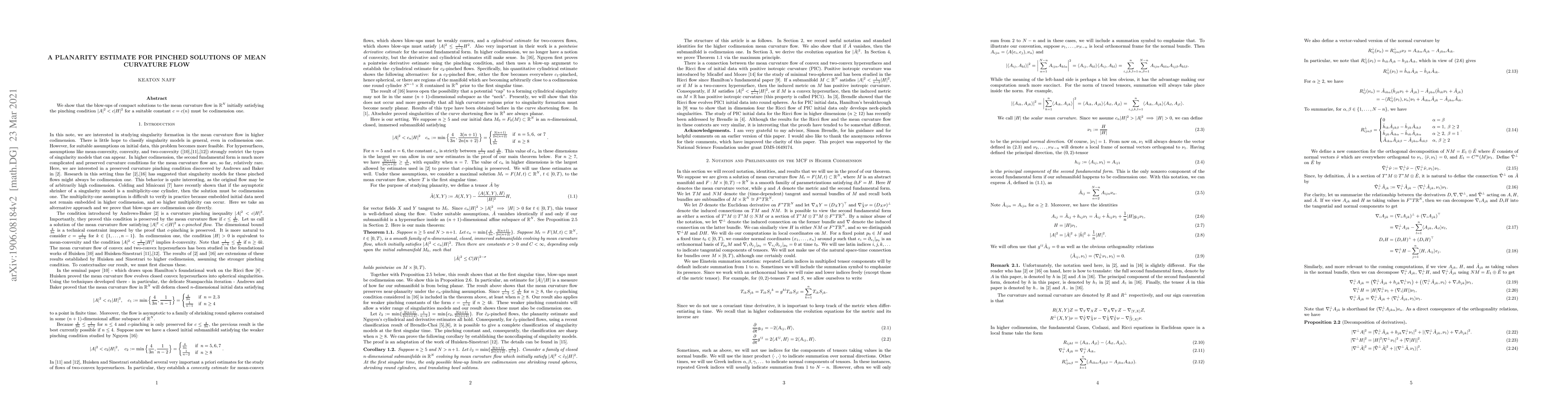 We show that the blow-ups of compact solutions to the mean curvature flow in $\mathbb{R}^N$ initially satisfying the pinching condition $|A|^2 < c |H|^2$ for a suitable constant $c = c(n)$ must be codimension one.