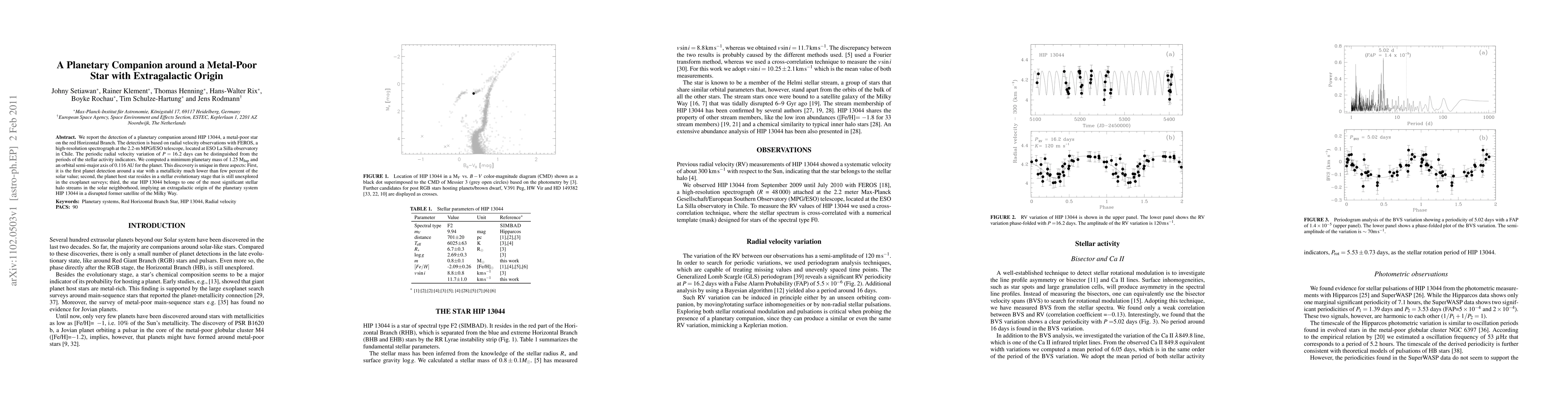 This paper reports the discovery of a planetary companion around HIP 13044, a metal-poor red Horizontal Branch star, detected via radial velocity observations. The planet, with a minimum mass of 1.25 MJup, is unique due to the star's low metallicity, its evolutionary stage, and the star's extragalactic origin linked to a disrupted satellite of the Milky Way.