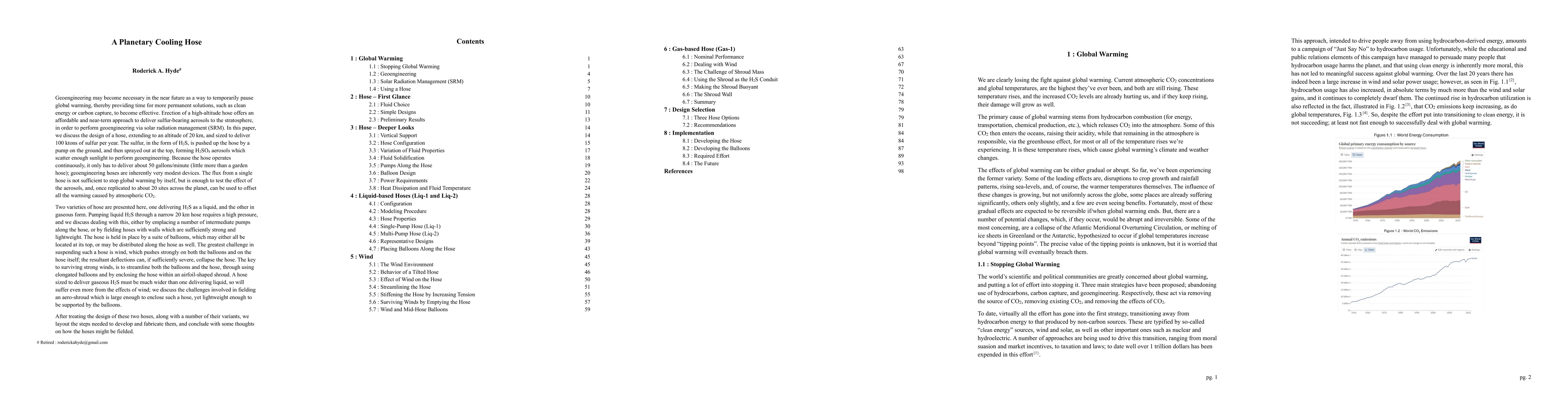 Geoengineering may offer a way to pause global warming, providing the time for more permanent solutions to become effective. Erection of a high-altitude hose offers an affordable and near-term approach to deliver sulfur-bearing fluids to the stratosphere in order to perform geoengineering via solar radiation management. We discuss the design of a hose extending to an altitude of 20 km and sized to deliver 100 ktons of sulfur per year. The sulfur, in the form of H$_2$S, is pushed up the hose by a pump on the ground and then sprayed out at the top, forming H$_2$SO$_4$ aerosols which scatter enough sunlight to perform geoengineering. Because the hose operates continuously, it only has to deliver about 50 gallons/minute (little more than a garden hose). The flux from a single hose is not sufficient to stop global warming by itself, but is enough to test the effect of the aerosols, and, once replicated to about 20 sites across the planet, can offset all the warming caused by atmospheric CO$_2$. Two varieties of hose are presented here, one delivering H$_2$S as a liquid and the other as a gas. Pumping liquid H$_2$S through a narrow 20 km hose requires high pressure, which can be handled by strong and lightweight hose walls or by placing intermediate pumps along the hose. The hose is held up by a suite of balloons, either all at its top, or with some placed along its length as well. The greatest challenge in suspending such a hose is wind, which if not dealt with properly (by streamlining both the balloons and the hose) will collapse the hose. The wide hoses needed to deliver gaseous H$_2$S are particularly susceptible to wind, so must be enclosed within lightweight aero-shrouds to reduce wind forces. After treating the design of these two hoses, we lay out the steps needed to develop and fabricate them, and conclude with some thoughts on how the hoses might be fielded.
