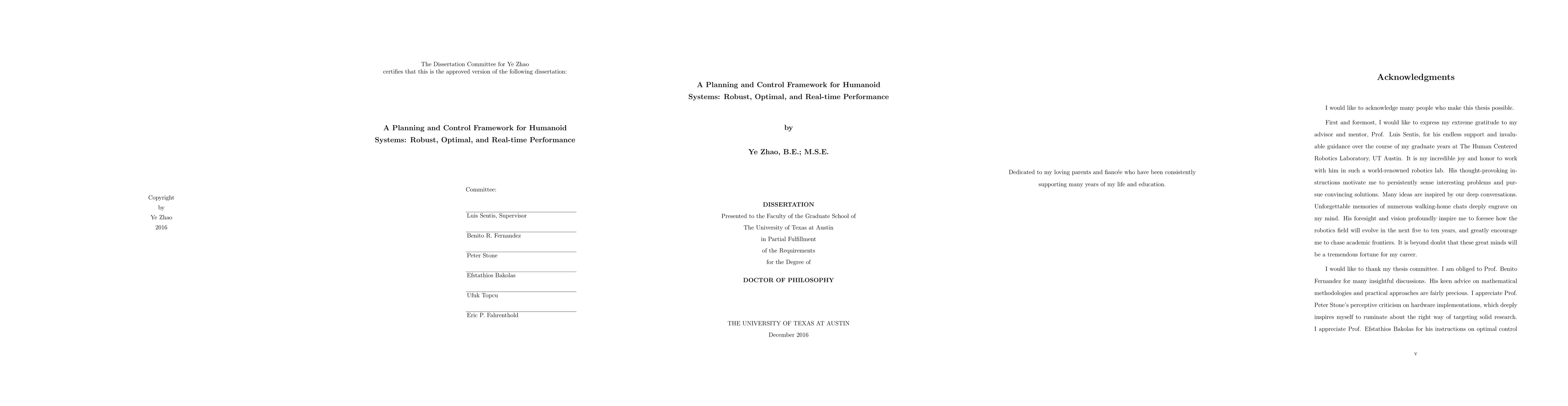 This paper presents a comprehensive planning and control framework for humanoid robots, focusing on robust, optimal, and real-time performance. It includes a hybrid motion planner for dynamic locomotion, a two-player temporal logic game for reactive whole-body planning, and a distributed control architecture that optimizes damping feedback for stability despite latency.