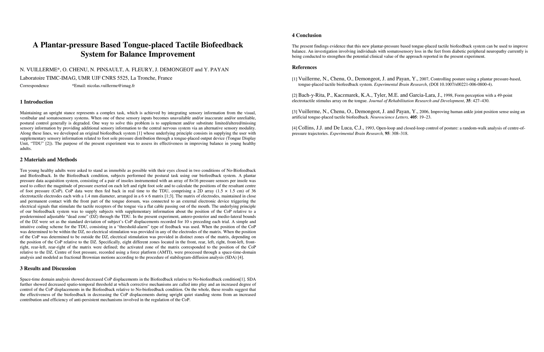This study developed a plantar-pressure based biofeedback system using a tongue-placed tactile device to provide supplementary sensory information for balance improvement. The experiment evaluated its effectiveness in enhancing balance control in young, healthy adults.