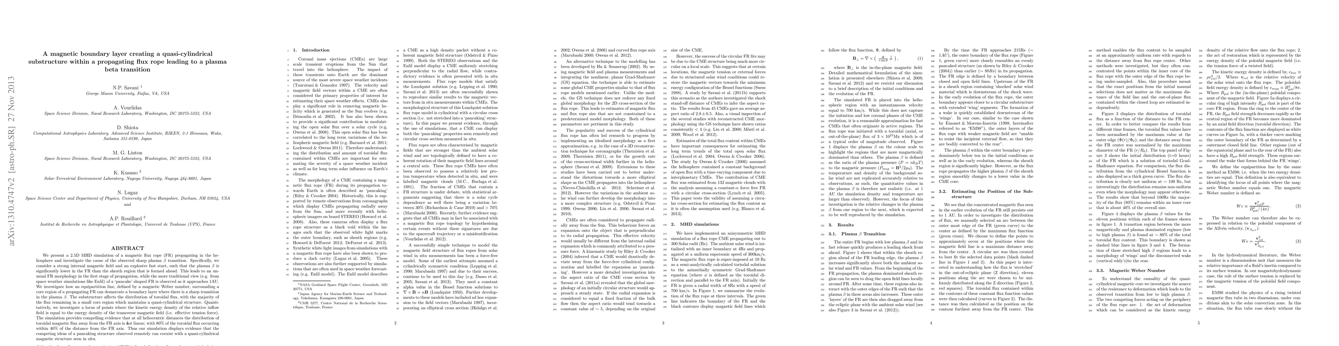 We present a 2.5D MHD simulation of a magnetic flux rope (FR) propagating in the heliosphere and investigate the cause of the observed sharp plasma beta transition. Specifically, we consider a strong internal magnetic field and an explosive fast start, such that the plasma beta is significantly lower in the FR than the sheath region that is formed ahead. This leads to an unusual FR morphology in the first stage of propagation, while the more traditional view (e.g. from space weather simulations like Enlil) of a `pancake' shaped FR is observed as it approaches 1 AU. We investigate how an equipartition line, defined by a magnetic Weber number, surrounding a core region of a propagating FR can demarcate a boundary layer where there is a sharp transition in the plasma beta. The substructure affects the distribution of toroidal flux, with the majority of the flux remaining in a small core region which maintains a quasi-cylindrical structure. Quantitatively, we investigate a locus of points where the kinetic energy density of the relative inflow field is equal to the energy density of the transverse magnetic field (i.e. effective tension force). The simulation provides compelling evidence that at all heliocentric distances the distribution of toroidal magnetic flux away from the FR axis is not linear; with 80% of the toroidal flux occurring within 40% of the distance from the FR axis. Thus our simulation displays evidence that the competing ideas of a pancaking structure observed remotely can coexist with a quasi-cylindrical magnetic structure seen in situ.