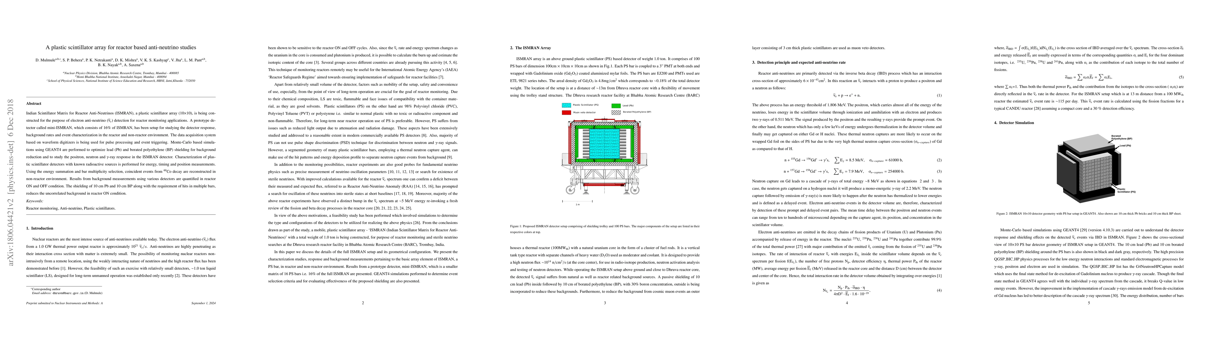 The ISMRAN plastic scintillator array is designed for electron anti-neutrino detection in reactor monitoring. A prototype mini-ISMRAN setup evaluates detector response and background rates, with data acquisition using waveform digitizers and GEANT4 simulations for shielding optimization.