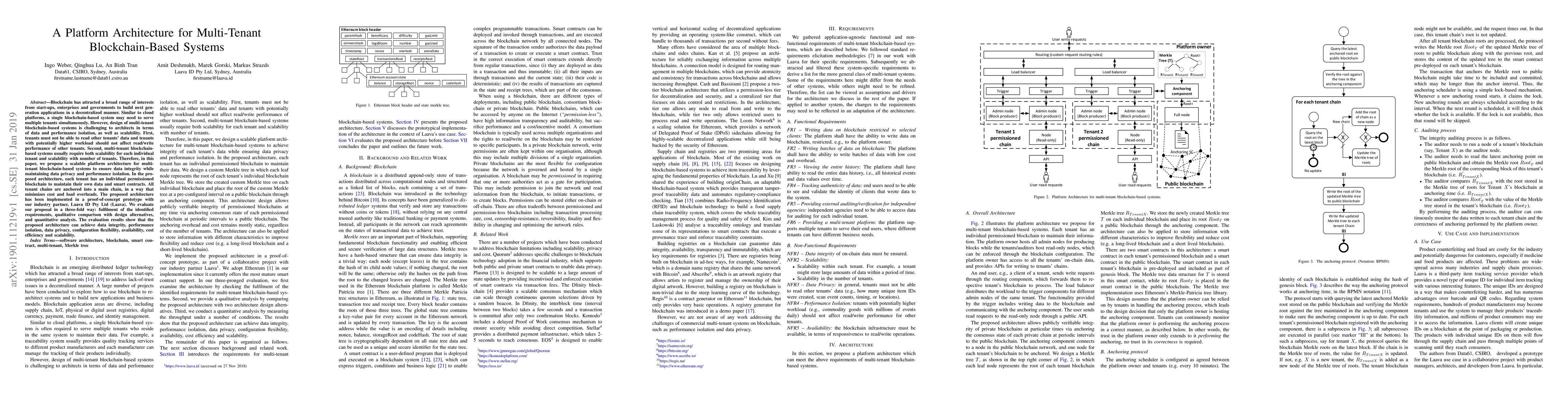 Blockchain has attracted a broad range of interests from start-ups, enterprises and governments to build next generation applications in a decentralized manner. Similar to cloud platforms, a single blockchain-based system may need to serve multiple tenants simultaneously. However, design of multi-tenant blockchain-based systems is challenging to architects in terms of data and performance isolation, as well as scalability. First, tenants must not be able to read other tenants' data and tenants with potentially higher workload should not affect read/write performance of other tenants. Second, multi-tenant blockchain-based systems usually require both scalability for each individual tenant and scalability with number of tenants. Therefore, in this paper, we propose a scalable platform architecture for multi-tenant blockchain-based systems to ensure data integrity while maintaining data privacy and performance isolation. In the proposed architecture, each tenant has an individual permissioned blockchain to maintain their own data and smart contracts. All tenant chains are anchored into a main chain, in a way that minimizes cost and load overheads. The proposed architecture has been implemented in a proof-of-concept prototype with our industry partner, Laava ID Pty Ltd (Laava). We evaluate our proposal in a three-fold way: fulfilment of the identified requirements, qualitative comparison with design alternatives, and quantitative analysis. The evaluation results show that the proposed architecture can achieve data integrity, performance isolation, data privacy, configuration flexibility, availability, cost efficiency and scalability.