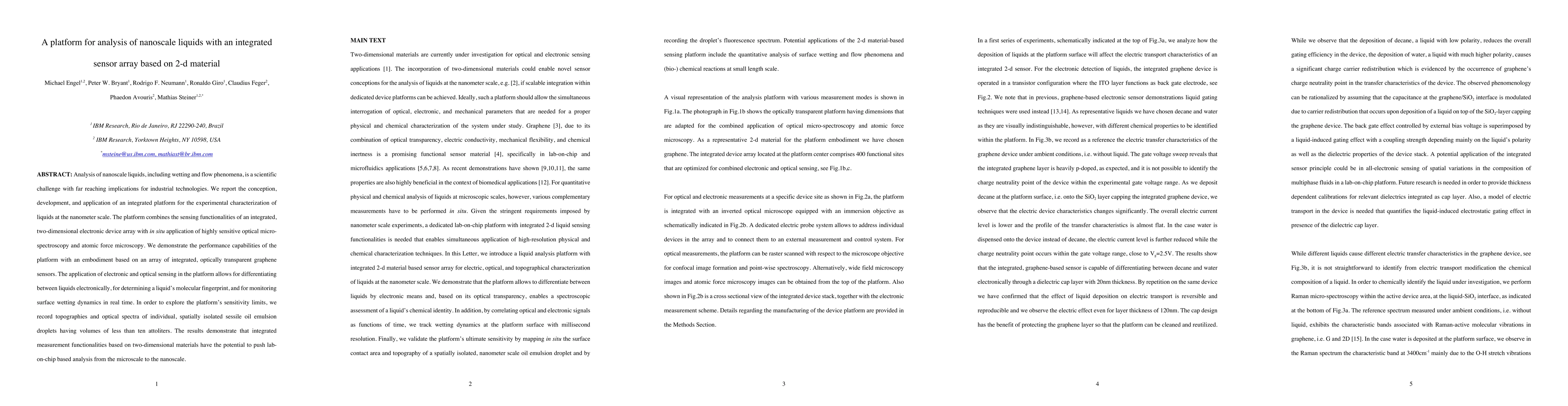 Analysis of nanoscale liquids, including wetting and flow phenomena, is a scientific challenge with far reaching implications for industrial technologies. We report the conception, development, and application of an integrated platform for the experimental characterization of liquids at the nanometer scale. The platform combines the sensing functionalities of an integrated, two-dimensional electronic device array with in situ application of highly sensitive optical micro-spectroscopy and atomic force microscopy. We demonstrate the performance capabilities of the platform with an embodiment based on an array of integrated, optically transparent graphene sensors. The application of electronic and optical sensing in the platform allows for differentiating between liquids electronically, for determining a liquid's molecular fingerprint, and for monitoring surface wetting dynamics in real time. In order to explore the platform's sensitivity limits, we record topographies and optical spectra of individual, spatially isolated sessile oil emulsion droplets having volumes of less than ten attoliters. The results demonstrate that integrated measurement functionalities based on two-dimensional materials have the potential to push lab-on-chip based analysis from the microscale to the nanoscale.