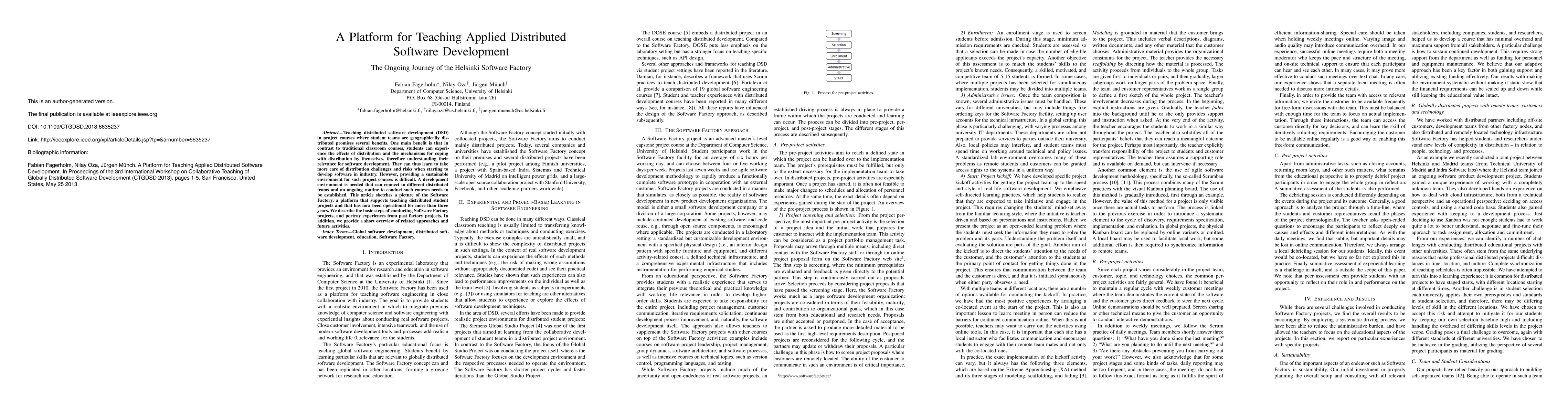 This paper discusses the Helsinki Software Factory, a platform for teaching applied distributed software development. It outlines the benefits of geographically distributed student projects and describes the ongoing journey and experiences of the platform over three years, including project steps and future plans.