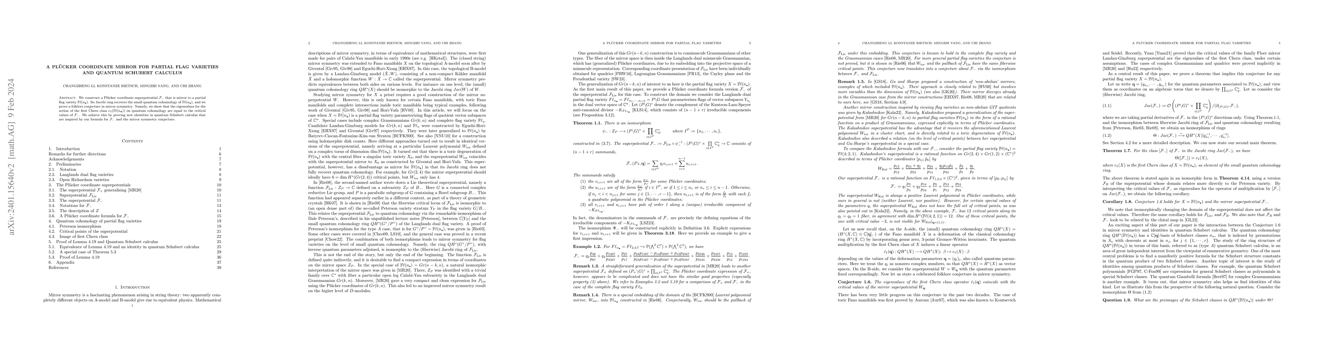 This paper constructs a Plücker coordinate superpotential that mirrors a partial flag variety, demonstrating its Jacobi ring recovers the small quantum cohomology. It proves a conjecture in mirror symmetry by showing the eigenvalues of the first Chern class action on quantum cohomology match the critical values of the superpotential, supported by new identities in quantum Schubert calculus.