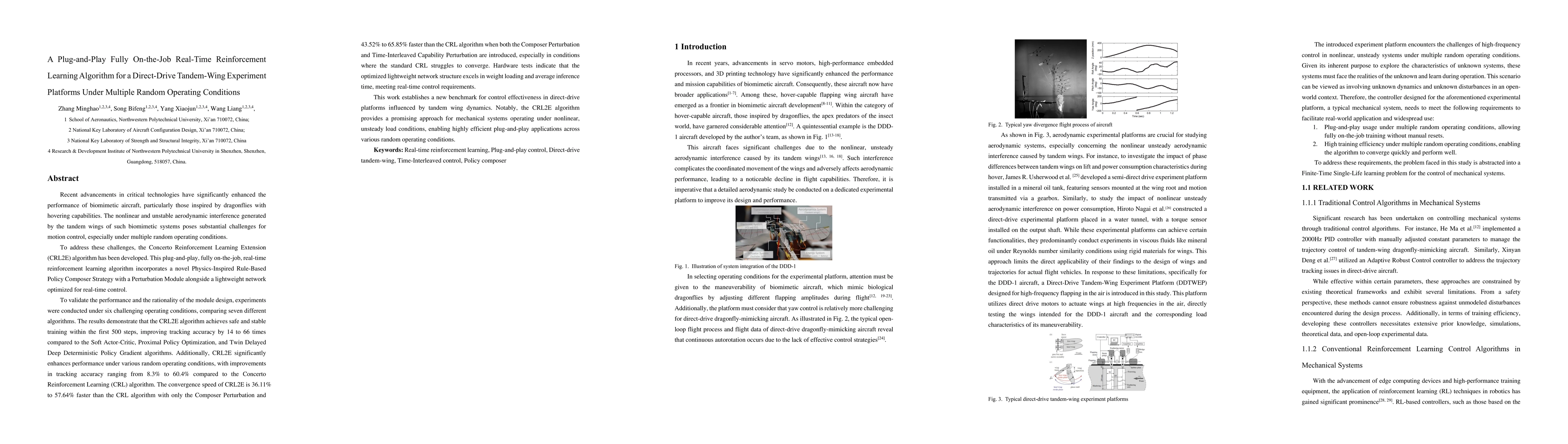 The nonlinear and unstable aerodynamic interference generated by the tandem wings of such biomimetic systems poses substantial challenges for motion control, especially under multiple random operating conditions. To address these challenges, the Concerto Reinforcement Learning Extension (CRL2E) algorithm has been developed. This plug-and-play, fully on-the-job, real-time reinforcement learning algorithm incorporates a novel Physics-Inspired Rule-Based Policy Composer Strategy with a Perturbation Module alongside a lightweight network optimized for real-time control. To validate the performance and the rationality of the module design, experiments were conducted under six challenging operating conditions, comparing seven different algorithms. The results demonstrate that the CRL2E algorithm achieves safe and stable training within the first 500 steps, improving tracking accuracy by 14 to 66 times compared to the Soft Actor-Critic, Proximal Policy Optimization, and Twin Delayed Deep Deterministic Policy Gradient algorithms. Additionally, CRL2E significantly enhances performance under various random operating conditions, with improvements in tracking accuracy ranging from 8.3% to 60.4% compared to the Concerto Reinforcement Learning (CRL) algorithm. The convergence speed of CRL2E is 36.11% to 57.64% faster than the CRL algorithm with only the Composer Perturbation and 43.52% to 65.85% faster than the CRL algorithm when both the Composer Perturbation and Time-Interleaved Capability Perturbation are introduced, especially in conditions where the standard CRL struggles to converge. Hardware tests indicate that the optimized lightweight network structure excels in weight loading and average inference time, meeting real-time control requirements.