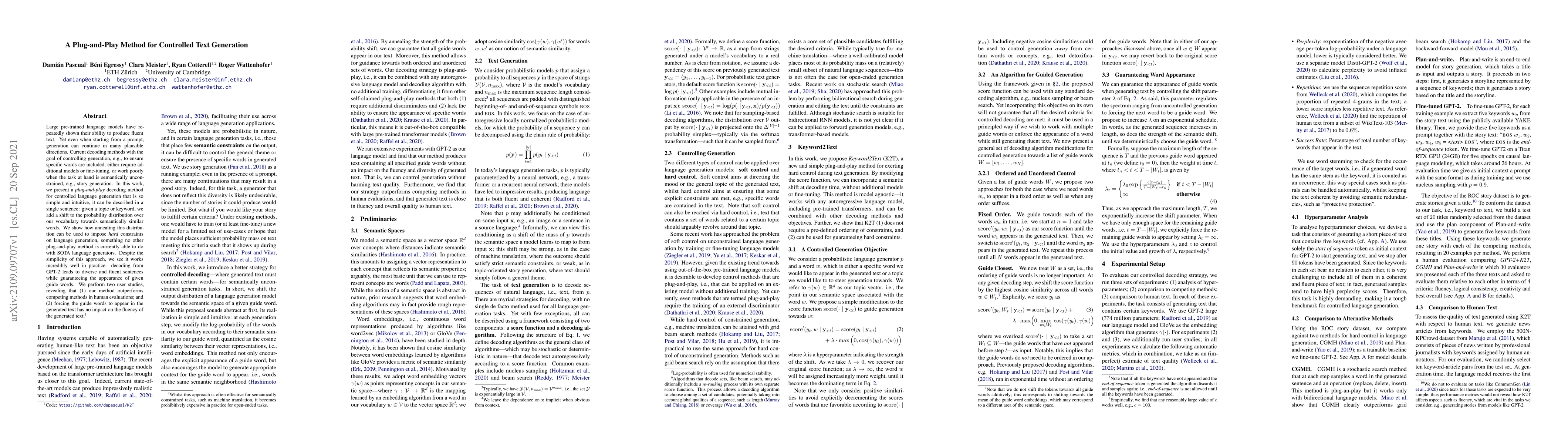 This paper presents a simple plug-and-play decoding method for controlled text generation by shifting the probability distribution towards semantically similar words, which effectively imposes hard constraints without requiring additional models or fine-tuning. The method outperforms competing approaches in user studies, maintaining fluency while ensuring specified guide words appear in the generated text.