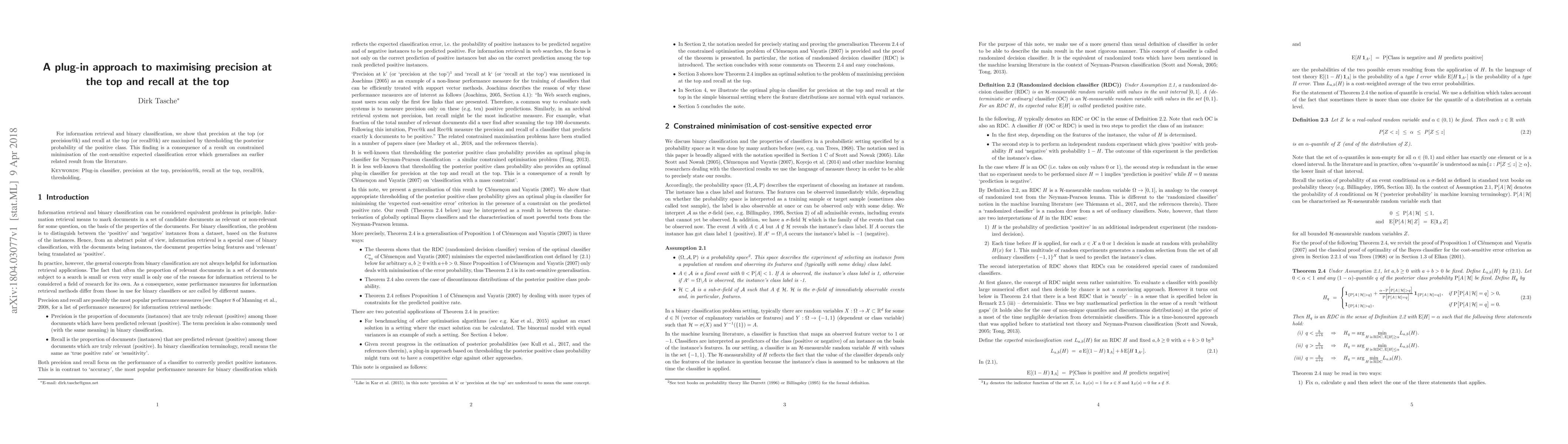 For information retrieval and binary classification, we show that precision at the top (or precision at k) and recall at the top (or recall at k) are maximised by thresholding the posterior probability of the positive class. This finding is a consequence of a result on constrained minimisation of the cost-sensitive expected classification error which generalises an earlier related result from the literature.