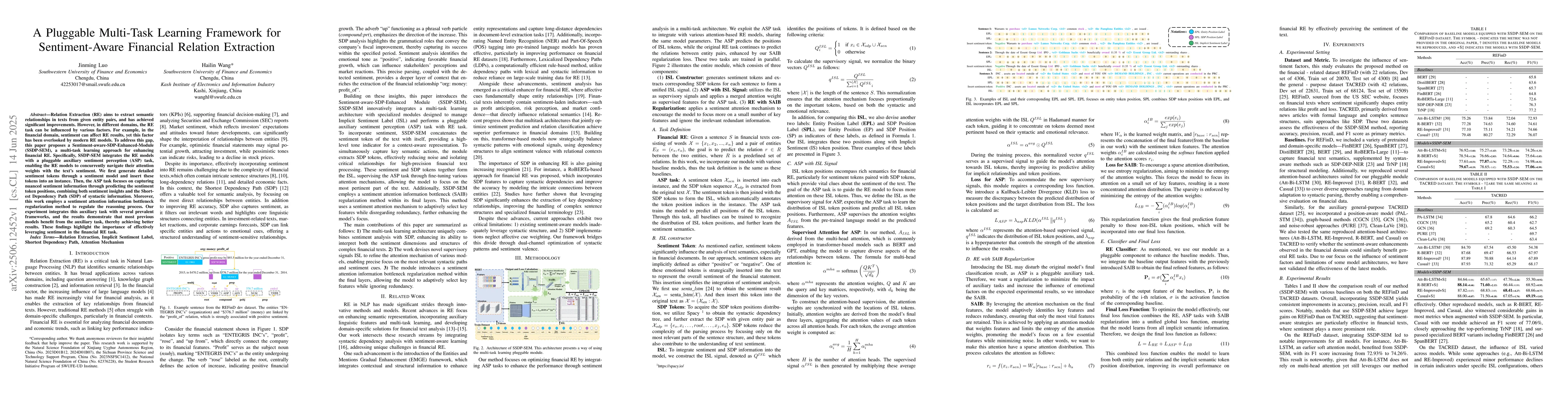 Relation Extraction (RE) aims to extract semantic relationships in texts from given entity pairs, and has achieved significant improvements. However, in different domains, the RE task can be influenced by various factors. For example, in the financial domain, sentiment can affect RE results, yet this factor has been overlooked by modern RE models. To address this gap, this paper proposes a Sentiment-aware-SDP-Enhanced-Module (SSDP-SEM), a multi-task learning approach for enhancing financial RE. Specifically, SSDP-SEM integrates the RE models with a pluggable auxiliary sentiment perception (ASP) task, enabling the RE models to concurrently navigate their attention weights with the text's sentiment. We first generate detailed sentiment tokens through a sentiment model and insert these tokens into an instance. Then, the ASP task focuses on capturing nuanced sentiment information through predicting the sentiment token positions, combining both sentiment insights and the Shortest Dependency Path (SDP) of syntactic information. Moreover, this work employs a sentiment attention information bottleneck regularization method to regulate the reasoning process. Our experiment integrates this auxiliary task with several prevalent frameworks, and the results demonstrate that most previous models benefit from the auxiliary task, thereby achieving better results. These findings highlight the importance of effectively leveraging sentiment in the financial RE task.