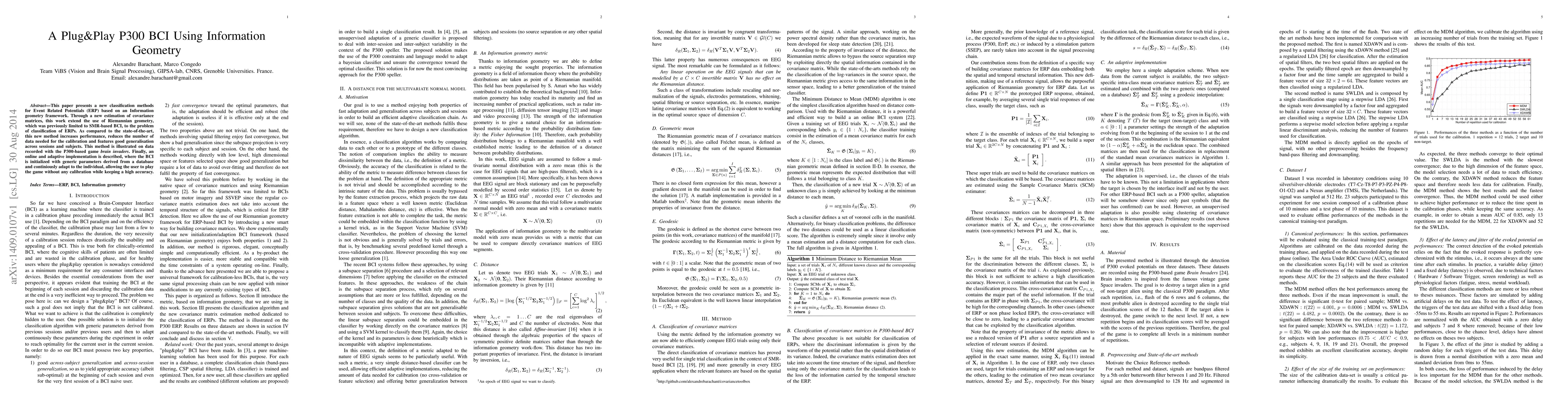 This paper presents a new classification methods for Event Related Potentials (ERP) based on an Information geometry framework. Through a new estimation of covariance matrices, this work extend the use of Riemannian geometry, which was previously limited to SMR-based BCI, to the problem of classification of ERPs. As compared to the state-of-the-art, this new method increases performance, reduces the number of data needed for the calibration and features good generalisation across sessions and subjects. This method is illustrated on data recorded with the P300-based game brain invaders. Finally, an online and adaptive implementation is described, where the BCI is initialized with generic parameters derived from a database and continuously adapt to the individual, allowing the user to play the game without any calibration while keeping a high accuracy.