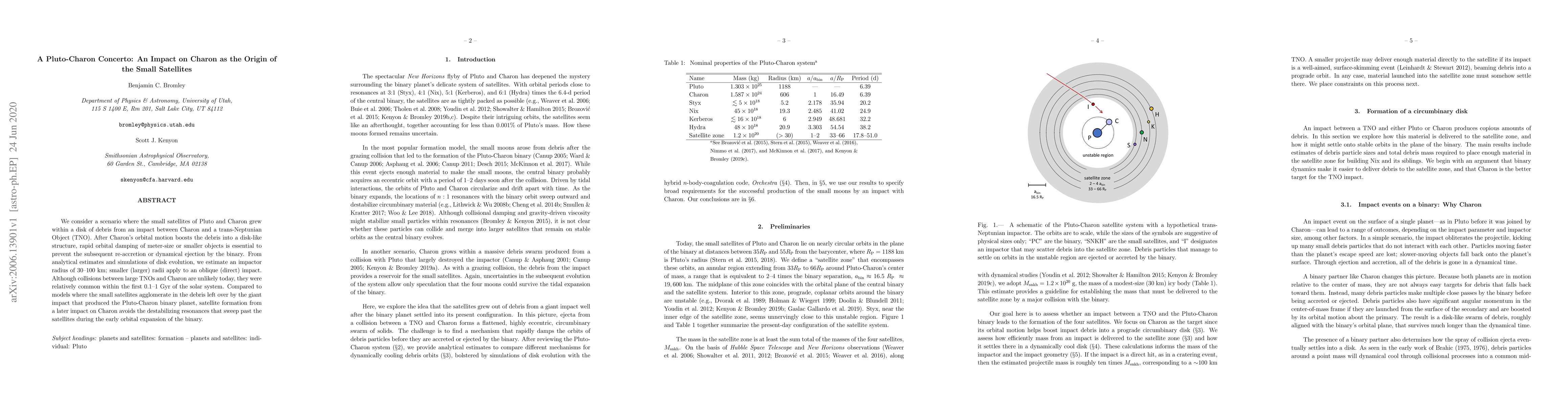 This paper proposes that Pluto's small satellites formed from debris resulting from a collision between Charon and a trans-Neptunian Object, avoiding destabilizing resonances compared to earlier models. The impactor is estimated to have a radius of 30-100 km, with smaller radii for oblique impacts.