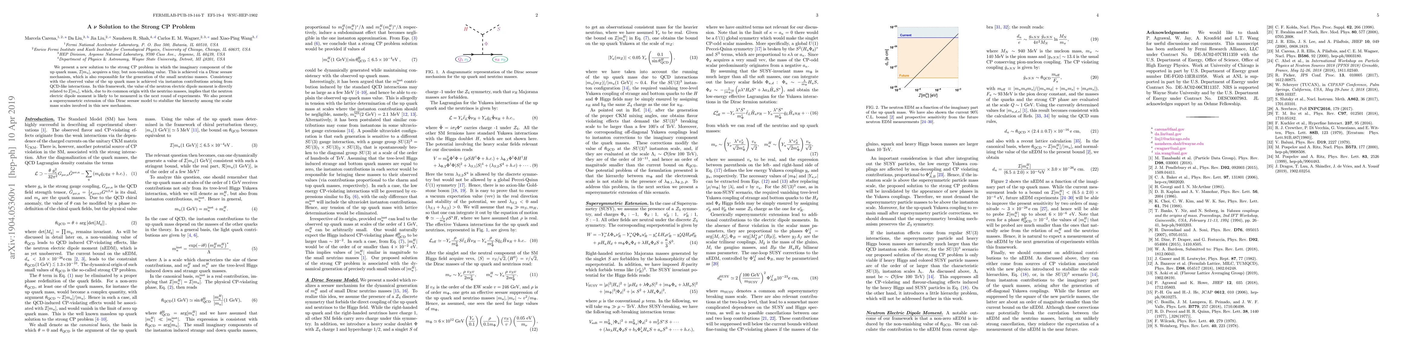 This paper proposes a novel solution to the strong CP problem through a Dirac seesaw mechanism, where the up quark mass acquires a tiny imaginary component, generating small neutrino masses and neutron electric dipole moment. A supersymmetric extension stabilizes the scalar mass hierarchy.