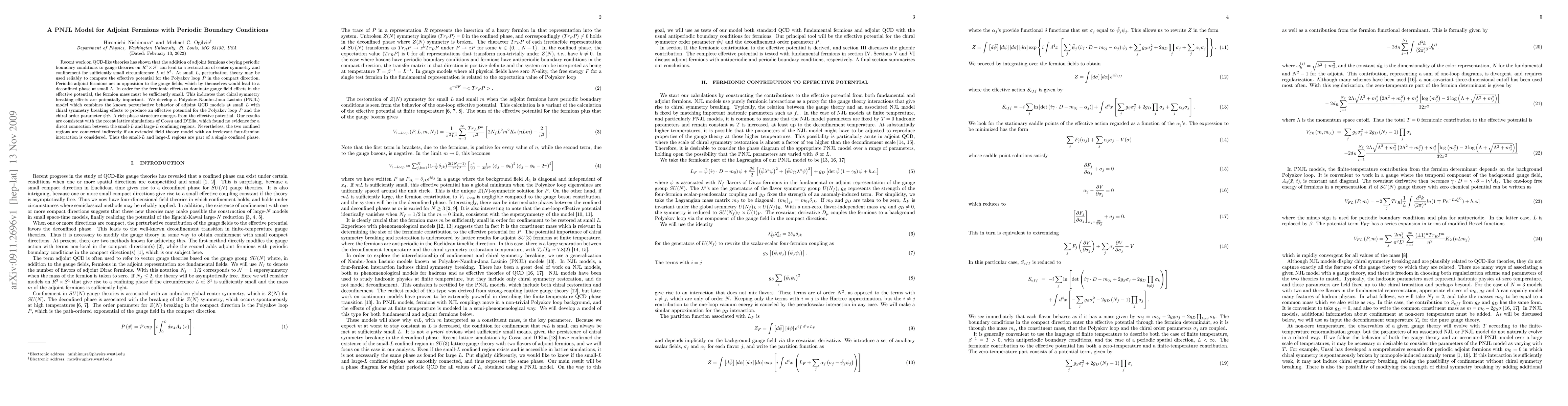 Recent work on QCD-like theories has shown that the addition of adjoint fermions obeying periodic boundary conditions to gauge theories on $R^{3}\times S^{1}$ can lead to a restoration of center symmetry and confinement for sufficiently small circumference $L$ of $S^{1}$. At small $L$, perturbation theory may be used reliably to compute the effective potential for the Polyakov loop $P$ in the compact direction. Periodic adjoint fermions act in opposition to the gauge fields, which by themselves would lead to a deconfined phase at small $L$. In order for the fermionic effects to dominate gauge field effects in the effective potential, the fermion mass must be sufficiently small. This indicates that chiral symmetry breaking effects are potentially important. We develop a Polyakov-Nambu-Jona Lasinio (PNJL) model which combines the known perturbative behavior of adjoint QCD models at small $L$ with chiral symmetry breaking effects to produce an effective potential for the Polyakov loop $P$ and the chiral order parameter $\bar{\psi}\psi$. A rich phase structure emerges from the effective potential. Our results are consistent with the recent lattice simulations of Cossu and D'Elia, which found no evidence for a direct connection between the small-$L$ and large-$L$ confining regions. Nevertheless, the two confined regions are connected indirectly if an extended field theory model with an irrelevant four-fermion interaction is considered. Thus the small-$L$ and large-$L$ regions are part of a single confined phase.