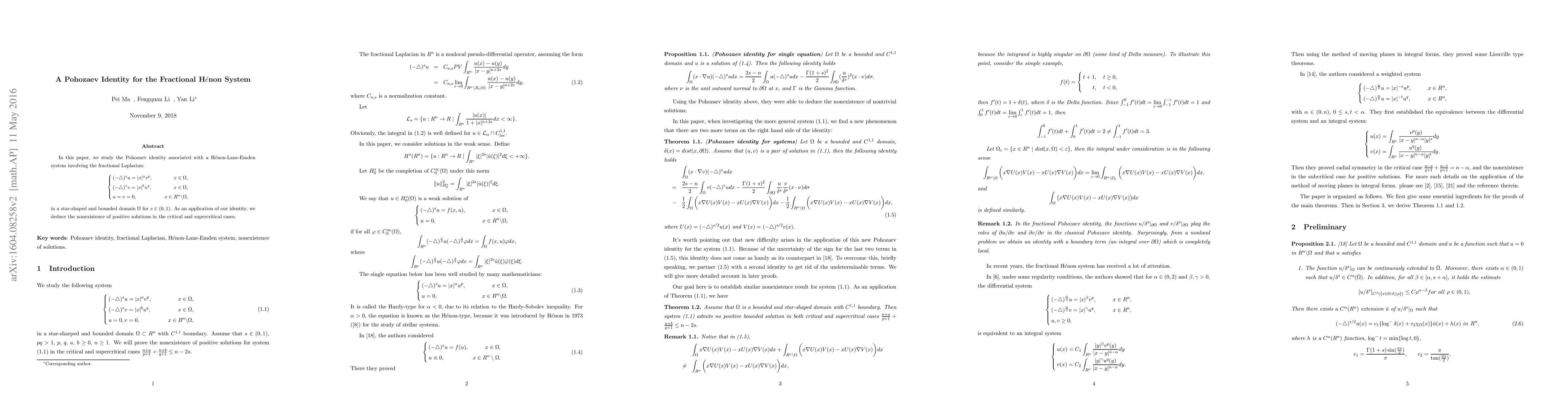 In this paper, we study the Pohozaev identity associated with a H$\acute{e}$non-Lane-Emden system involving the fractional Laplacian: \begin{equation} \left\{\begin{array}{ll} (-\triangle)^su=|x|^av^p,&x\in\Omega, (-\triangle)^sv=|x|^bu^q,&x\in\Omega, u=v=0,&x\in R^n\backslash\Omega, \end{array} \right. \end{equation} in a star-shaped and bounded domain $\Omega$ for $s\in(0,1)$. As an application of our identity, we deduce the nonexistence of positive solutions in the critical and supercritical cases.