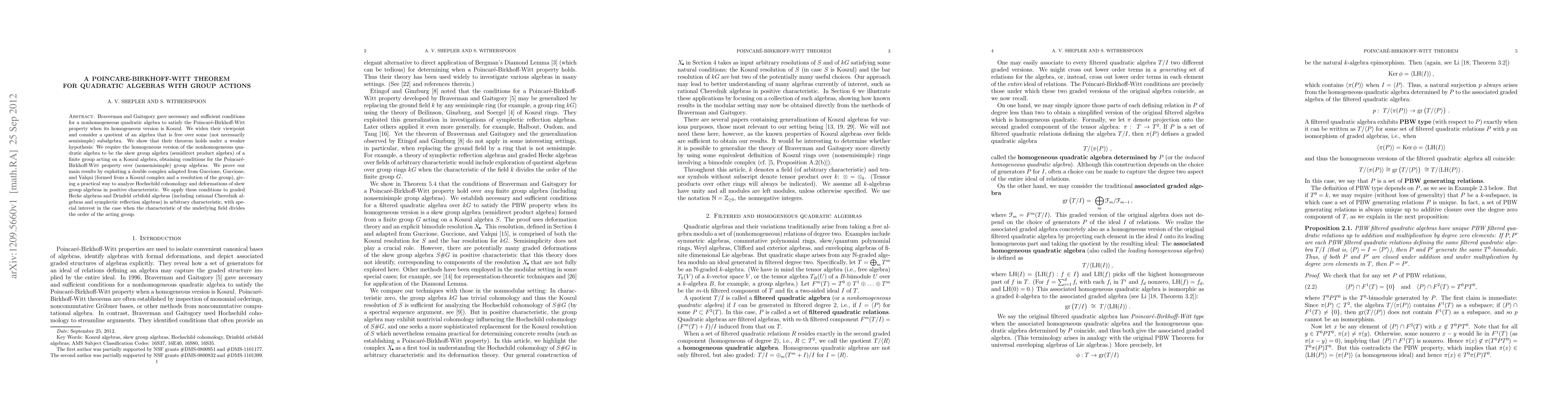 This paper extends the Poincare-Birkhoff-Witt theorem for nonhomogeneous quadratic algebras with group actions, showing its validity under weaker conditions. It uses a double complex approach to analyze Hochschild cohomology and deformations, applying these findings to graded Hecke algebras and Drinfeld orbifold algebras in arbitrary characteristic, especially when the field's characteristic divides the group's order.