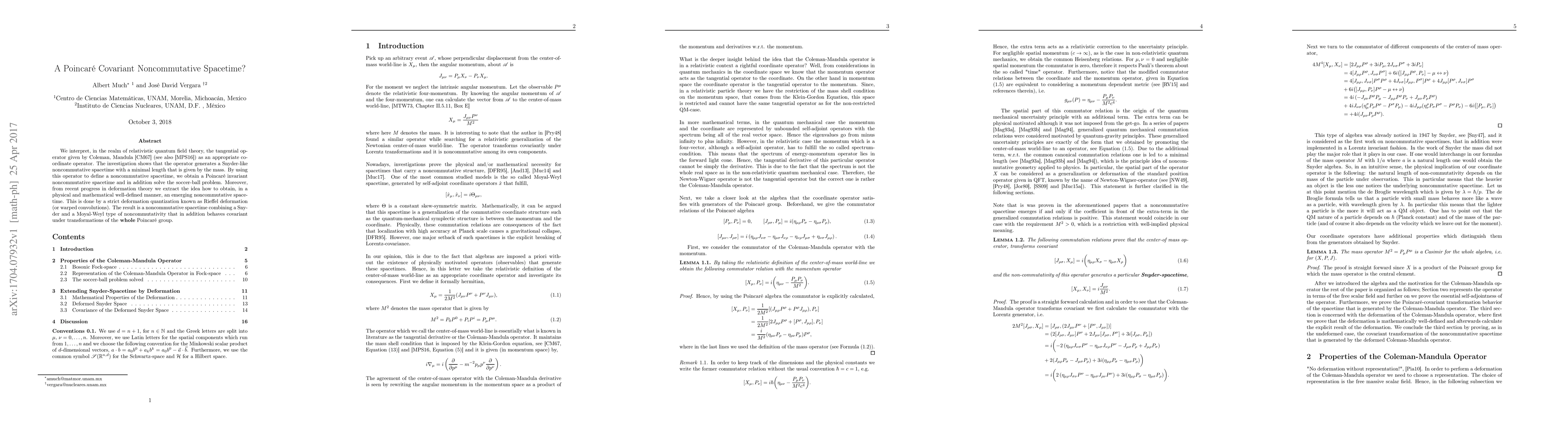 We interpret, in the realm of relativistic quantum field theory, the tangential operator given by Coleman, Mandula as an appropriate coordinate operator. The investigation shows that the operator generates a Snyder-like noncommutative spacetime with a minimal length that is given by the mass. By using this operator to define a noncommutative spacetime, we obtain a Poincar\'e invariant noncommutative spacetime and in addition solve the soccer-ball problem. Moreover, from recent progress in deformation theory we extract the idea how to obtain, in a physical and mathematical well-defined manner, an emerging noncommutative spacetime. This is done by a strict deformation quantization known as Rieffel deformation (or warped convolutions). The result is a noncommutative spacetime combining a Snyder and a Moyal-Weyl type of noncommutativity that in addition behaves covariant under transformations of the \textbf{whole} Poincar\'e group.