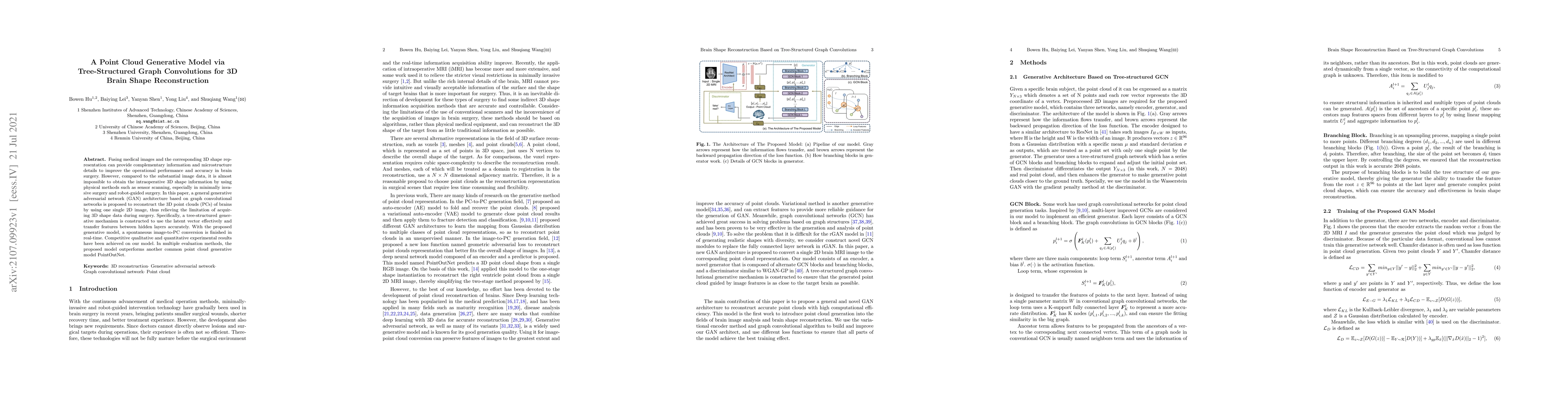 Fusing medical images and the corresponding 3D shape representation can provide complementary information and microstructure details to improve the operational performance and accuracy in brain surgery. However, compared to the substantial image data, it is almost impossible to obtain the intraoperative 3D shape information by using physical methods such as sensor scanning, especially in minimally invasive surgery and robot-guided surgery. In this paper, a general generative adversarial network (GAN) architecture based on graph convolutional networks is proposed to reconstruct the 3D point clouds (PCs) of brains by using one single 2D image, thus relieving the limitation of acquiring 3D shape data during surgery. Specifically, a tree-structured generative mechanism is constructed to use the latent vector effectively and transfer features between hidden layers accurately. With the proposed generative model, a spontaneous image-to-PC conversion is finished in real-time. Competitive qualitative and quantitative experimental results have been achieved on our model. In multiple evaluation methods, the proposed model outperforms another common point cloud generative model PointOutNet.