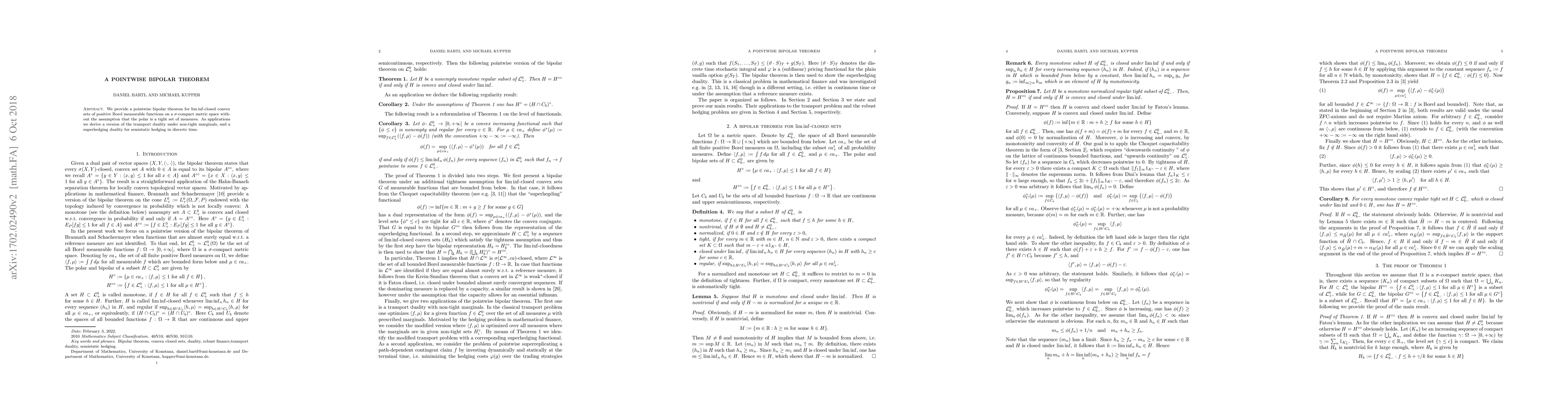 This paper establishes a pointwise bipolar theorem for liminf-closed convex sets on metric spaces without tight marginal assumptions, enabling applications in transport duality and superhedging duality.