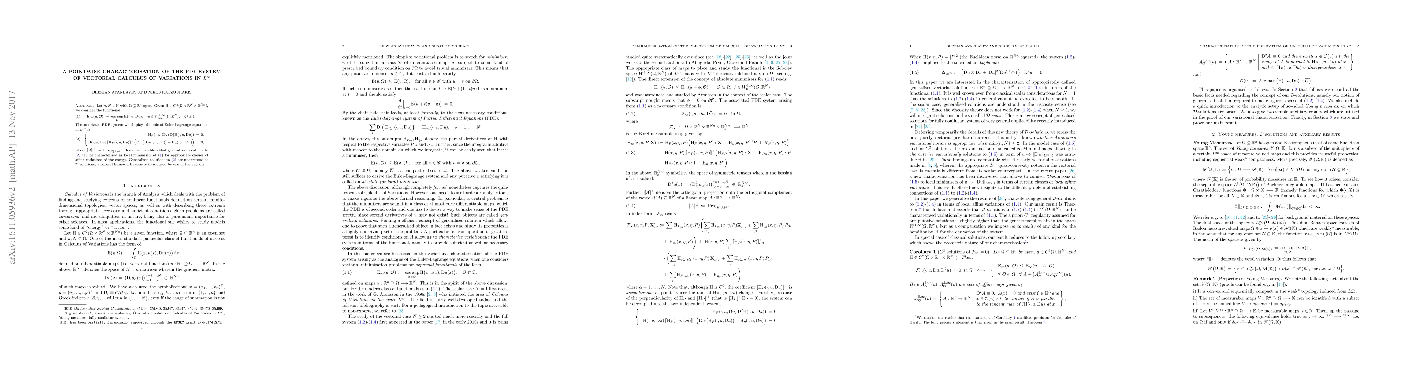 This paper characterises generalised solutions to a PDE system arising from the Euler-Lagrange equations of a functional in $L^\infty$. It establishes that these solutions can be identified as local minimisers of a specific functional involving the given PDE system.
