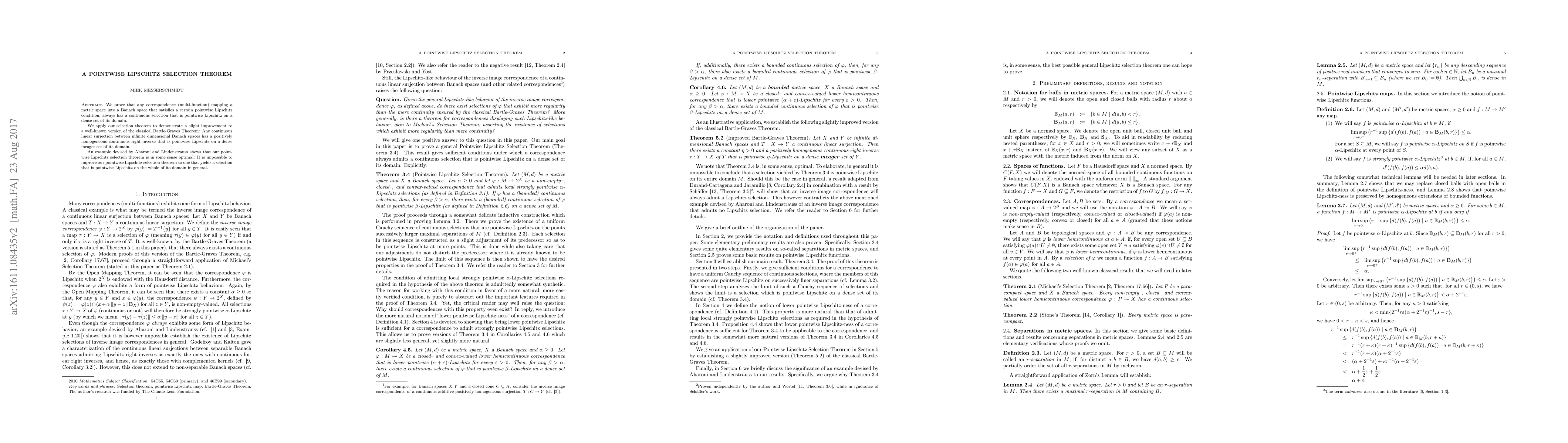 This paper proves a pointwise Lipschitz selection theorem for correspondences mapping a metric space into a Banach space, ensuring a continuous selection that is pointwise Lipschitz on a dense set. The theorem is applied to enhance the Bartle-Graves Theorem, yielding a pointwise Lipschitz right inverse for continuous linear surjections between infinite-dimensional Banach spaces.