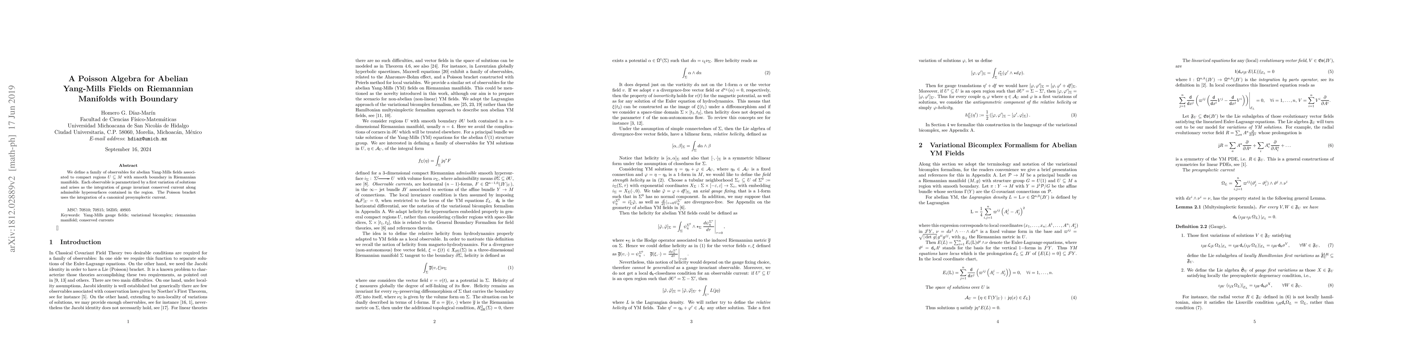 This paper introduces a Poisson algebra for observables of abelian Yang-Mills fields in Riemannian manifolds with boundaries, where each observable is derived from gauge invariant conserved currents integrated along admissible hypersurfaces. The structure is defined using a canonical presymplectic current for the Poisson bracket.