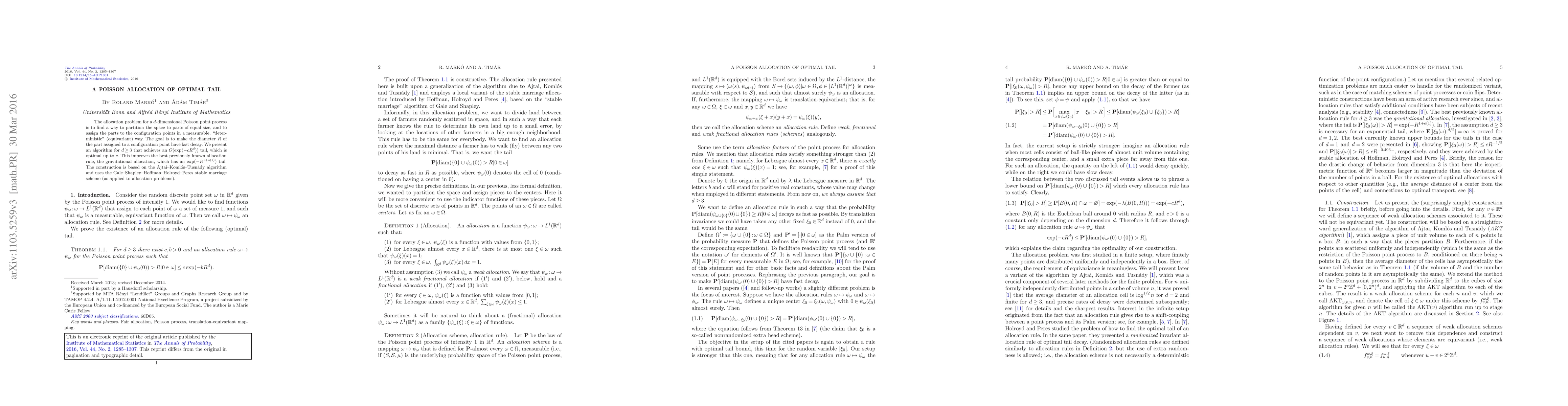 The allocation problem for a $d$-dimensional Poisson point process is to find a way to partition the space to parts of equal size, and to assign the parts to the configuration points in a measurable, "deterministic" (equivariant) way. The goal is to make the diameter $R$ of the part assigned to a configuration point have fast decay. We present an algorithm for $d\geq3$ that achieves an $O(\operatorname {exp}(-cR^d))$ tail, which is optimal up to $c$. This improves the best previously known allocation rule, the gravitational allocation, which has an $\operatorname {exp}(-R^{1+o(1)})$ tail. The construction is based on the Ajtai-Koml\'{o}s-Tusn\'{a}dy algorithm and uses the Gale-Shapley-Hoffman-Holroyd-Peres stable marriage scheme (as applied to allocation problems).