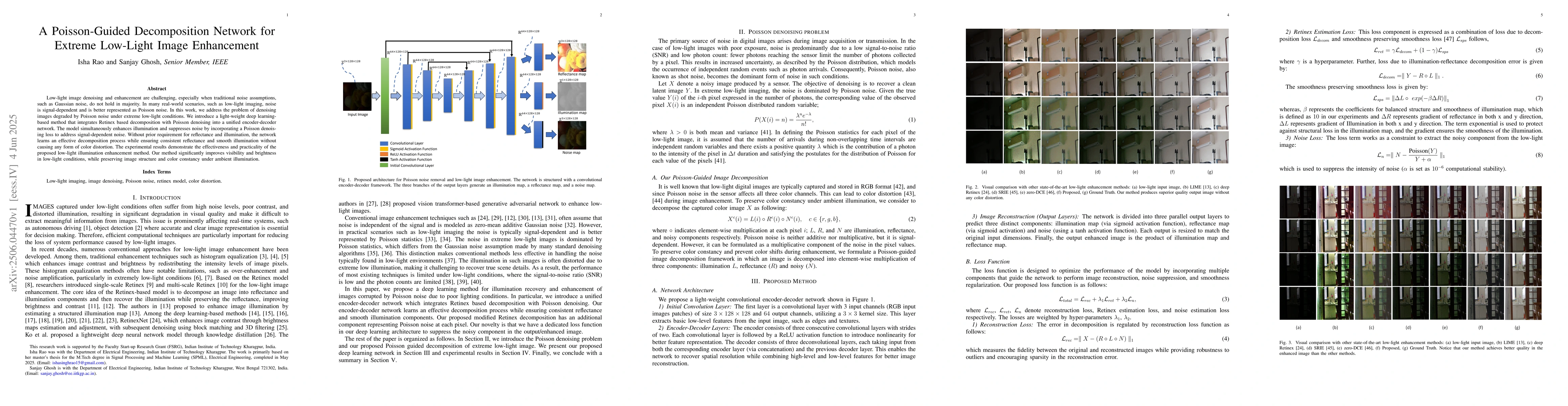 The novelty of this work lies in its unified approach to both Retinex decomposition and Poisson denoising within a single deep learning framework, tailored specifically for extreme low-light image enhancement.