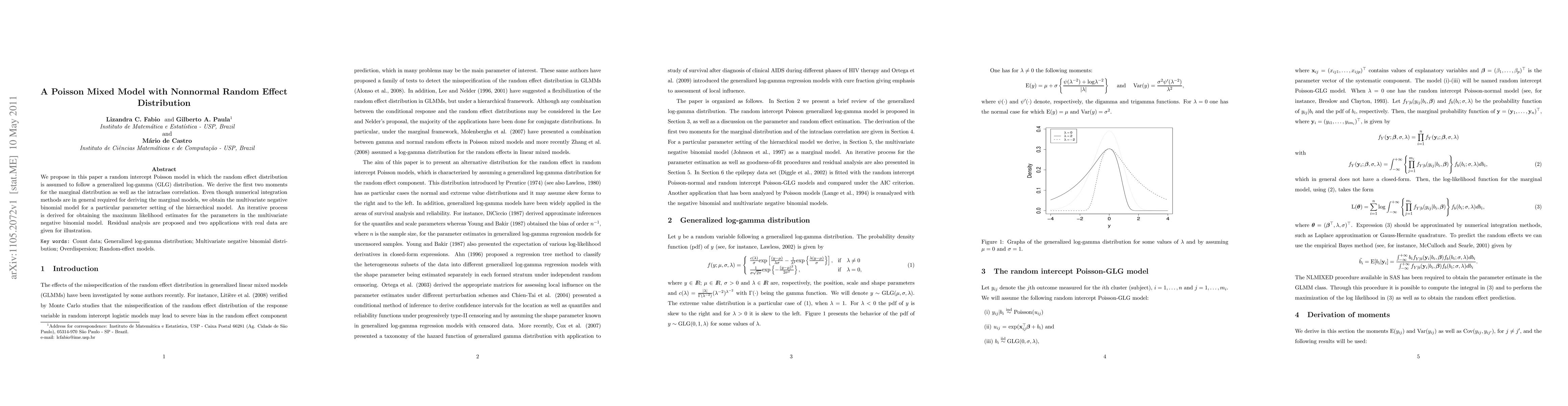 We propose in this paper a random intercept Poisson model in which the random effect distribution is assumed to follow a generalized log-gamma (GLG) distribution. We derive the first two moments for the marginal distribution as well as the intraclass correlation. Even though numerical integration methods are in general required for deriving the marginal models, we obtain the multivariate negative binomial model for a particular parameter setting of the hierarchical model. An iterative process is derived for obtaining the maximum likelihood estimates for the parameters in the multivariate negative binomial model. Residual analysis are proposed and two applications with real data are given for illustration.