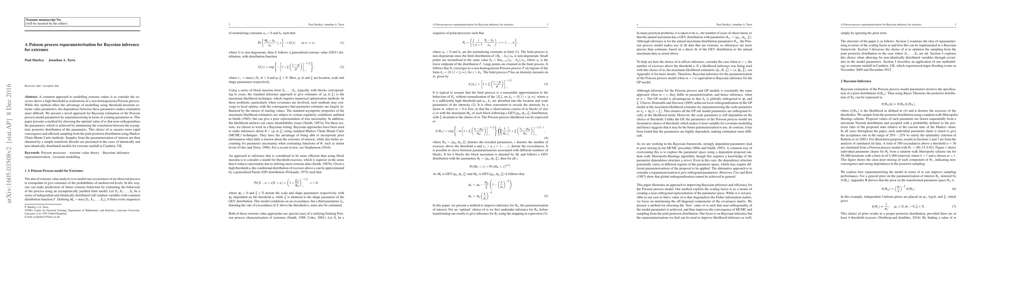 This paper proposes a reparameterisation of a Poisson process model for Bayesian inference on extreme values, using a tuning parameter $m$ to near-orthogonalise the parameters, thereby improving convergence and sampling efficiency. The method is demonstrated on extreme rainfall data in Cumbria, UK.