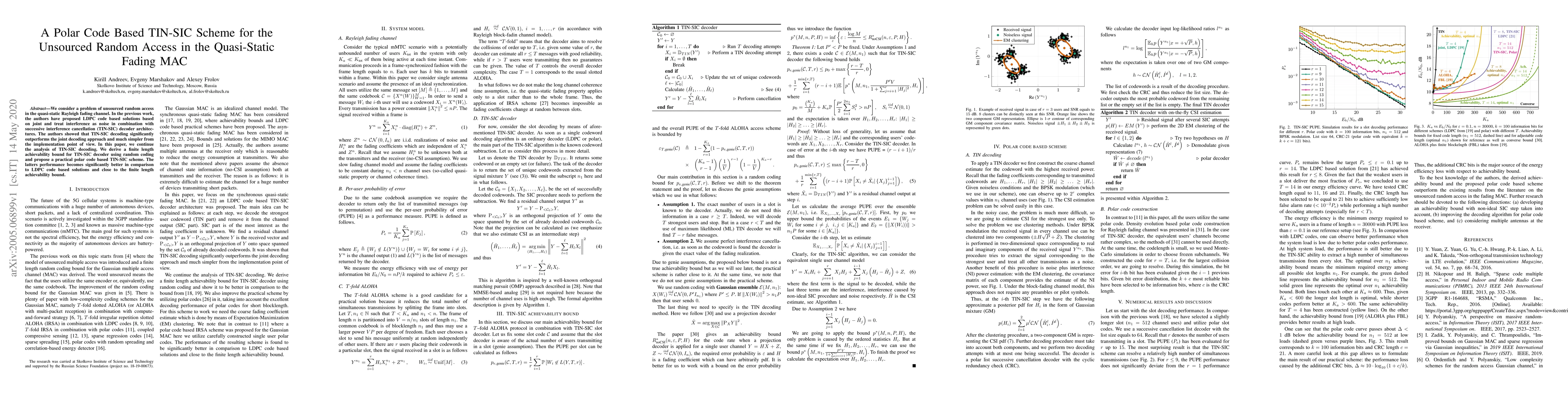 We consider a problem of unsourced random access in the quasi-static Rayleigh fading channel. In the previous work, the authors have proposed LDPC code based solutions based on joint and treat interference as noise in combination with successive interference cancellation (TIN-SIC) decoder architectures. The authors showed that TIN-SIC decoding significantly outperforms the joint decoding approach and much simpler from the implementation point of view. In this paper, we continue the analysis of TIN-SIC decoding. We derive a finite length achievability bound for TIN-SIC decoder using random coding and propose a practical polar code based TIN-SIC scheme. The latter's performance becomes significantly better in comparison to LDPC code based solutions and close to the finite length achievability bound.