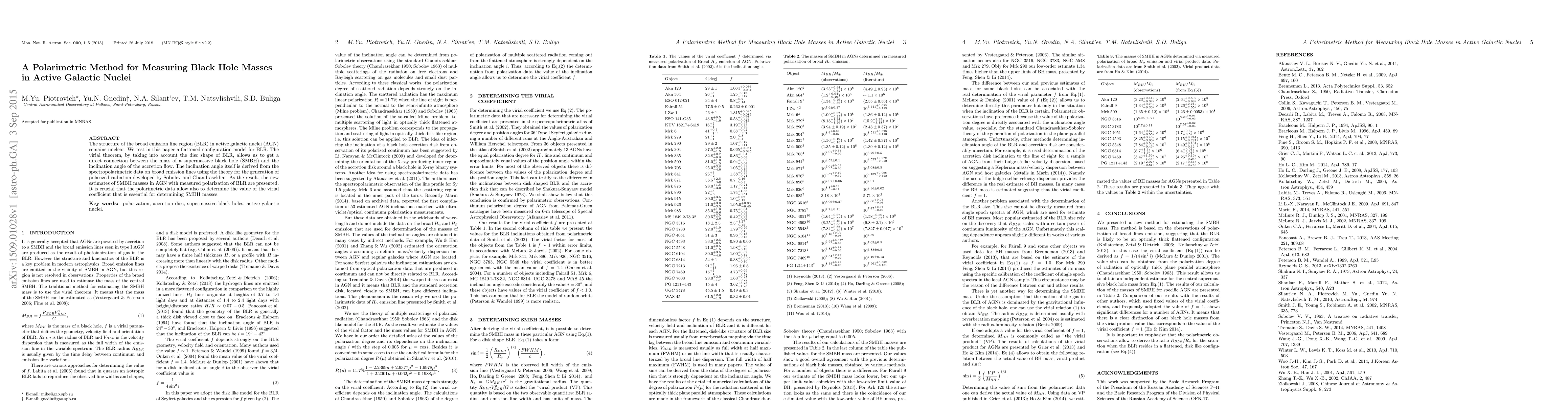 This paper proposes a polarimetric method to measure the masses of supermassive black holes in active galactic nuclei (AGN) by modeling the broad emission line region (BLR) as a flattened disc. The method uses the virial theorem and spectropolarimetric data to derive the inclination angle, which, combined with polarimetric data, provides new estimates of black hole masses.