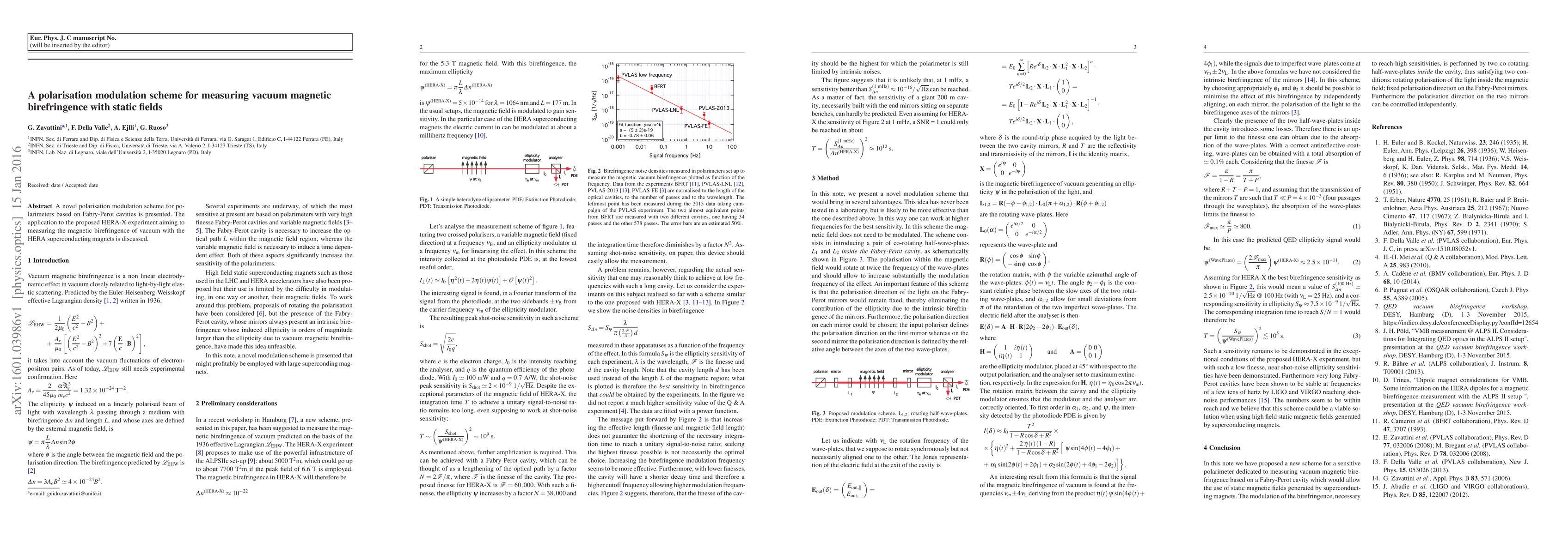The paper proposes a novel polarisation modulation scheme for polarimeters based on Fabry-Perot cavities, intended for the HERA-X experiment to measure vacuum magnetic birefringence using static superconducting magnets.