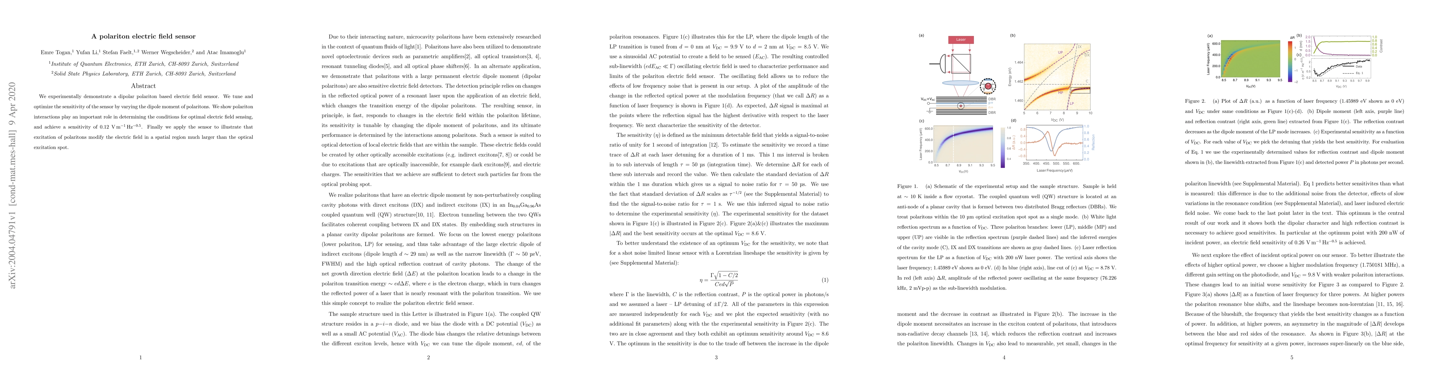 Researchers have developed a device that uses polaritons to sense electric fields with high sensitivity, achieving a detection limit of 0.12 V-m$^{-1}$-Hz$^{-0.5}$. The sensor can detect changes in the electric field over a large area beyond the optical excitation spot.