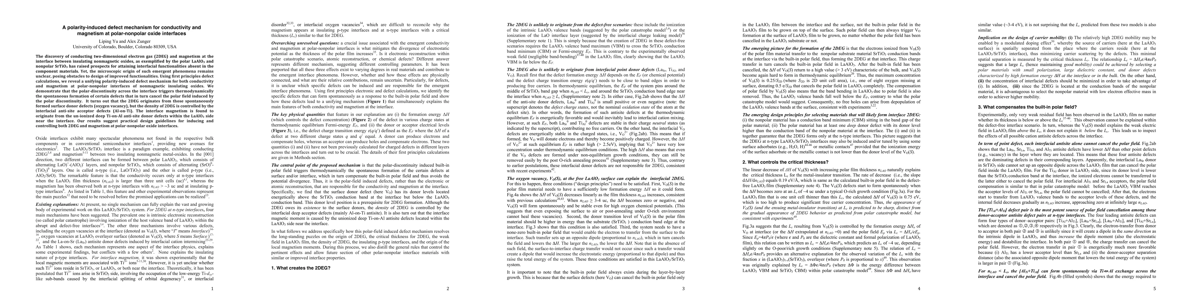 The study reveals a polarity-induced defect mechanism for the emergence of conducting and magnetic phenomena at polar-nonpolar oxide interfaces, showing how interface polar discontinuities trigger the formation of defects that cancel the polar field, leading to a two-dimensional electron gas and magnetism.