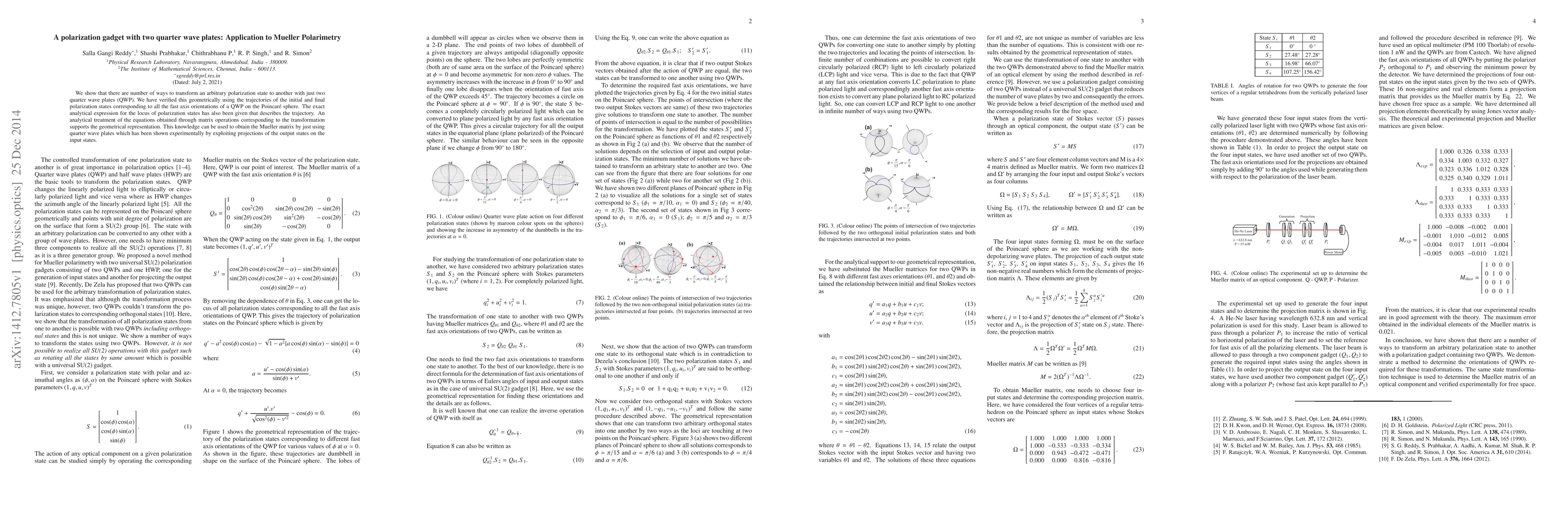 This paper demonstrates the use of two quarter wave plates to transform any polarization state, verified through geometric analysis on the Poincare sphere and supported by analytical equations. The findings enable the experimental determination of the Mueller matrix solely using quarter wave plates.