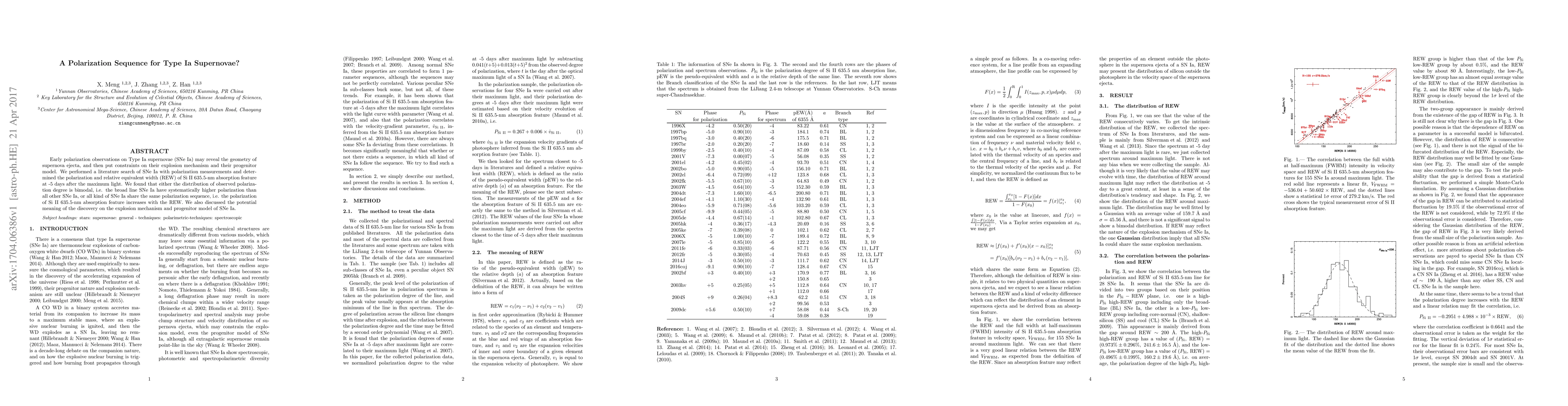 Early polarization observations on Type Ia supernovae (SNe Ia) may reveal the geometry of supernova ejecta, and then put constraints on their explosion mechanism and their progenitor model. We performed a literature search of SNe Ia with polarization measurements and determined the polarization and relative equivalent width (REW) of Si II 635.5-nm absorption feature at -5 days after the maximum light. We found that either the distribution of observed polarization degree is bimodal, i.e. the broad line SNe Ia have systematically higher polarization than all other SNe Ia, or all kind of SNe Ia share the same polarization sequence, i.e. the polarization of Si II 635.5-nm absorption feature increases with the REW. We also discussed the potential meaning of the discovery on the explosion mechanism and progenitor model of SNe Ia.
