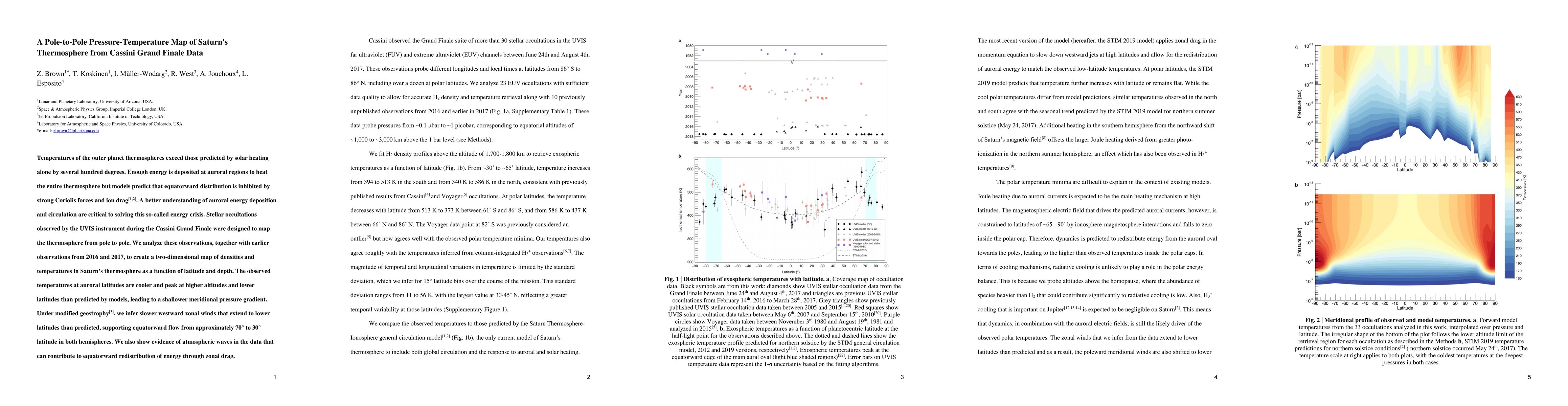 The study analyzes Saturn's thermosphere using Cassini data, revealing cooler temperatures at auroral latitudes and higher altitudes than predicted. It also shows evidence of atmospheric waves aiding energy equatorward redistribution. This suggests slower westward zonal winds extending to lower latitudes, supporting equatorward flow from 70 to 30 degrees in both hemispheres.